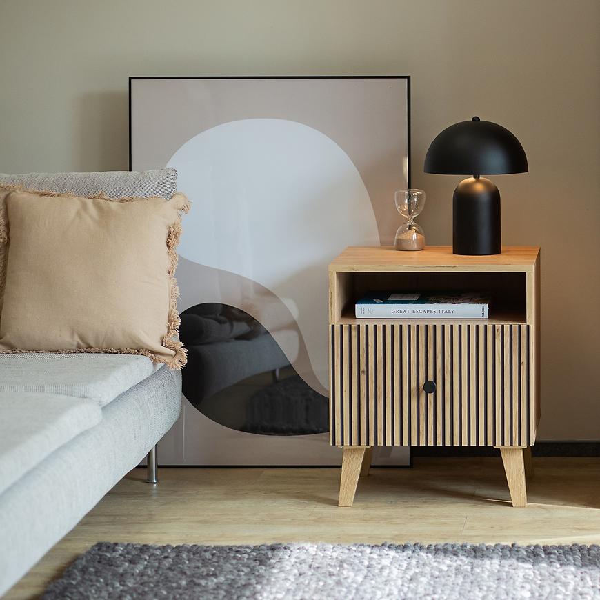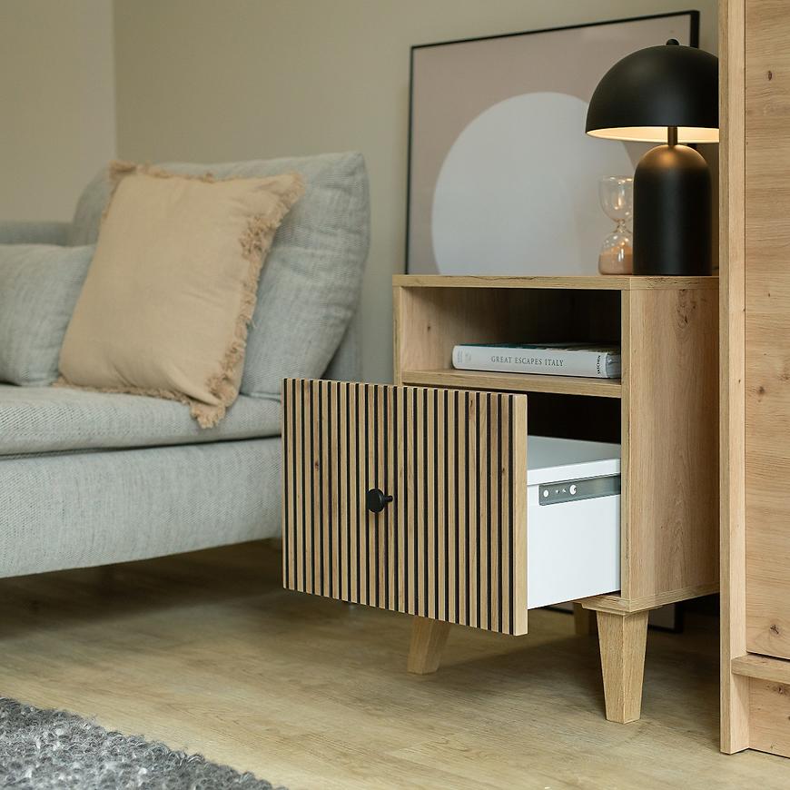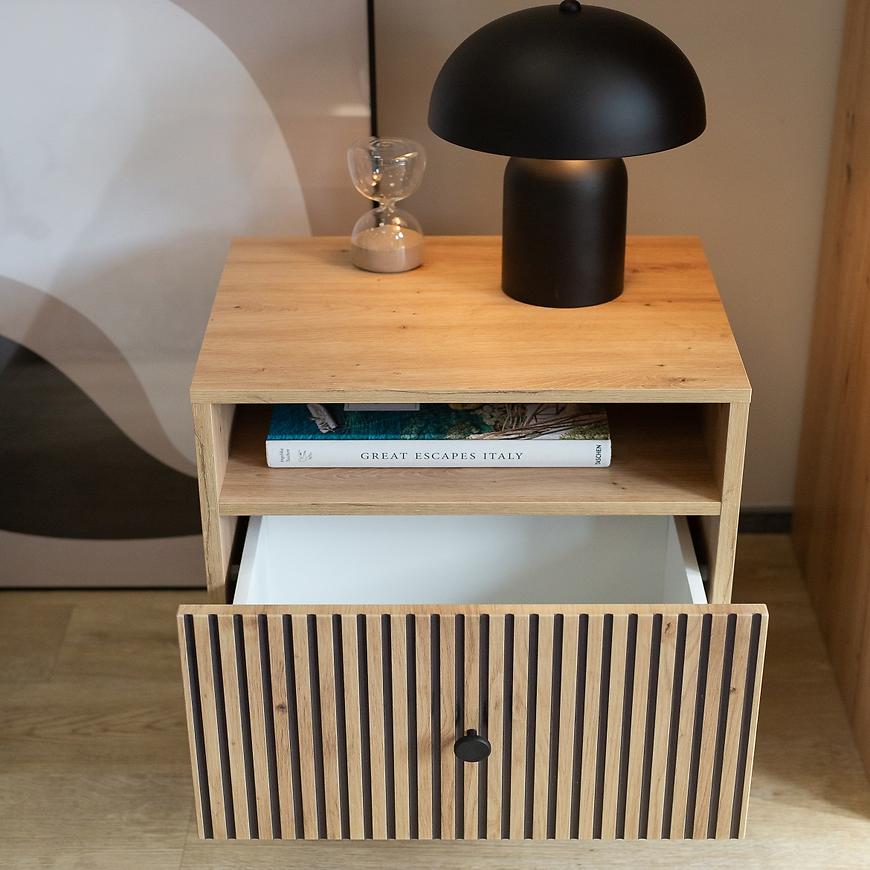 Dopełnieniem kolekcji jest szafka nocna z półką i szufladą, idealna do sypialni. Dzięki kompaktowym wymiarom i przemyślanej konstrukcji zapewnia wygodne miejsce na książki, lampkę nocną czy inne niezbędne przedmioty. Solidne wykonanie gwarantuje trwałość i komfort użytkowania przez wiele lat.