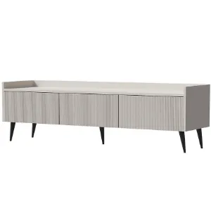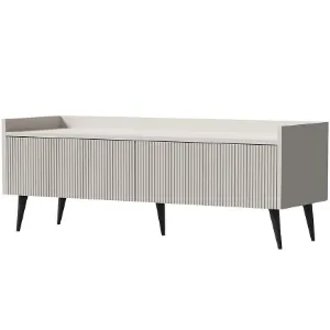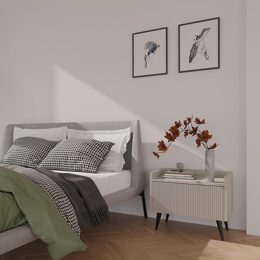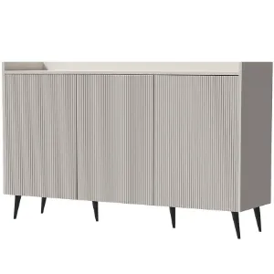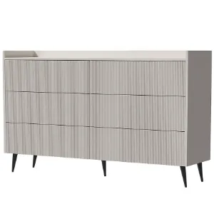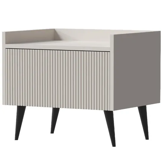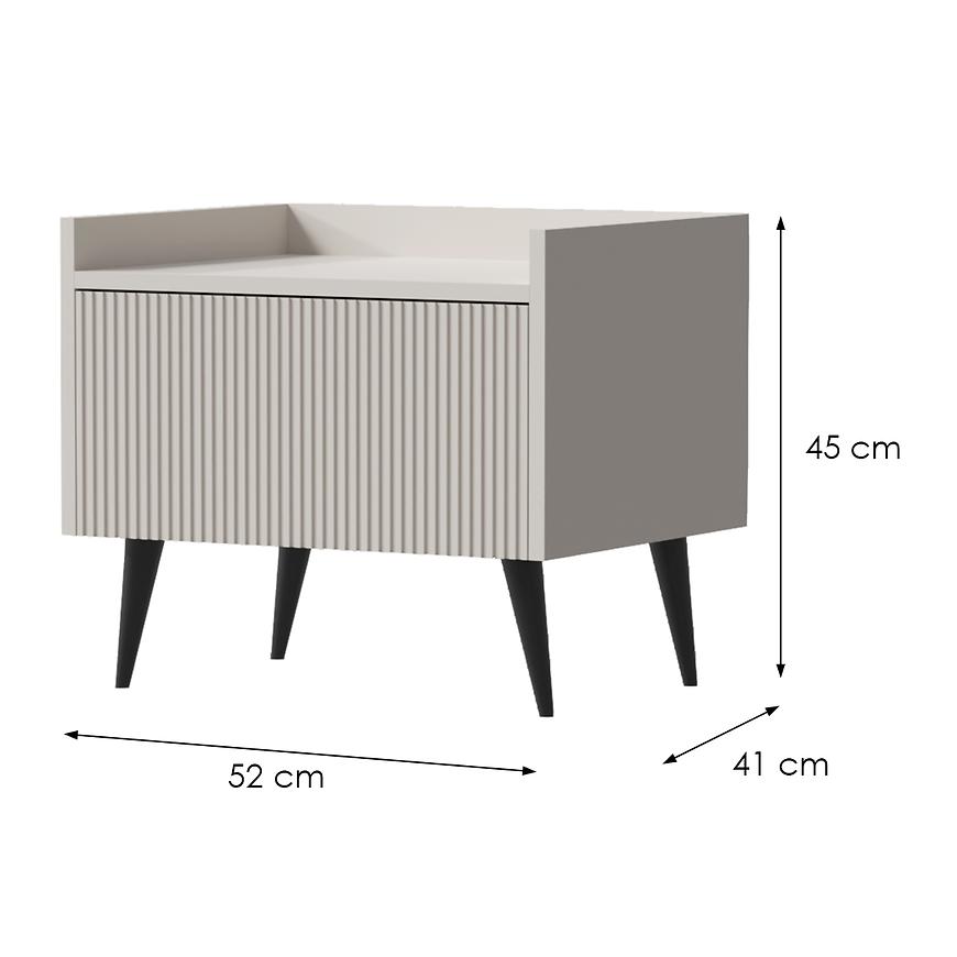 Meble wykonane są z wysokiej jakości płyty laminowanej, z ryflowanymi frontami, co zapewnia trwałość i estetyczny wygląd. Metalowe, czarne nóżki nadają lekkości konstrukcji i ułatwiają utrzymanie czystości pod meblami.