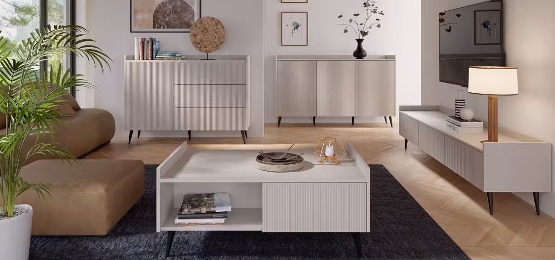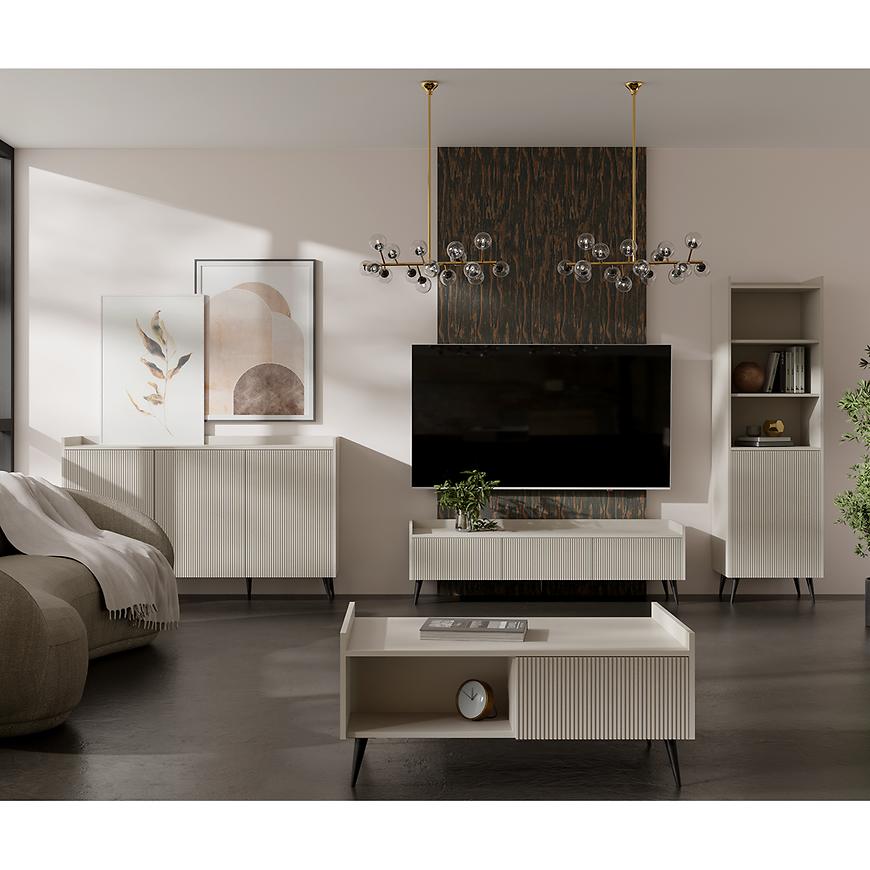 Kolekcja mebli do salonu ADEMO to połączenie elegancji i nowoczesnego designu, które wprowadza do wnętrza ciepło i styl. Charakteryzuje się ryflowanymi frontami w kolorze kaszmir, co nadaje meblom unikalny i przytulny wygląd.