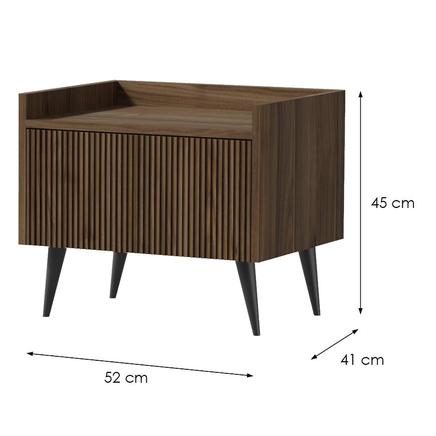 Szafka została wykonana z trwałej laminowanej płyty wiórowej, zarówno w części korpusu, jak i frontu, co gwarantuje odporność na codzienne użytkowanie. Orzechowy odcień nadaje meblowi elegancji i nowoczesnego charakteru. Całość dopełniają solidne metalowe nóżki, które dodają lekkości i stabilności.