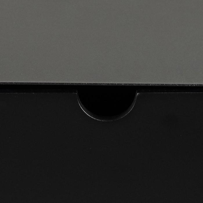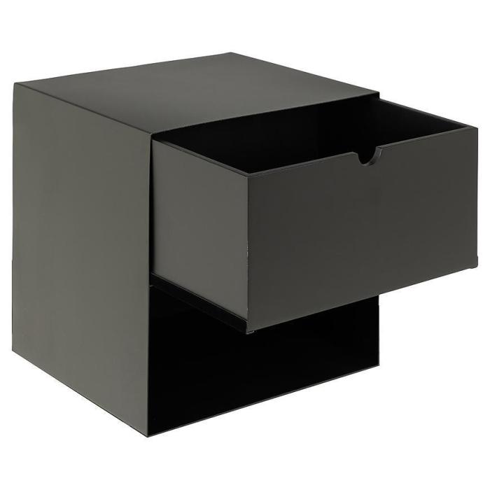 Stolik nocny Czarny to elegancki i funkcjonalny moduł. Materiał wykonania i design sprawią, że mebel idealnie wpiszę się w wiele aranżacji szczególnie w stylu loftowym i nowoczesnym. Korpus wykonany z metalu, a fronty to płyta MDF. Całość w matowym wykończeniu.