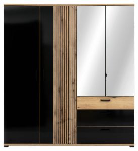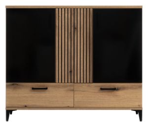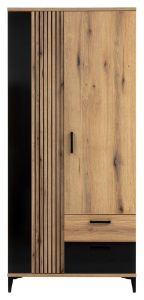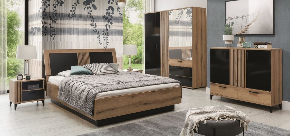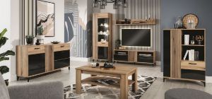 Kolekcja Aris to doskonałe połączenie klasyki z nowoczesnością, które sprawdzi się zarówno w pokoju dziennym, jak i sypialni. Ciepły odcień dębu evoke zestawiony z eleganckimi, czarnymi frontami w połysku nadaje meblom wyrafinowanego charakteru, podkreślając ich wyjątkowy styl. Fronty wzbogacone efektem lameli dodają głębi i unikalnej struktury, czyniąc aranżację wnętrza jeszcze bardziej efektowną.