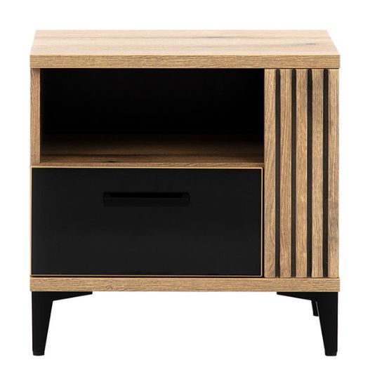 Szafka nocna Aris dostępna w kolorze korpusu dąb evoke, front w kolorze dąb evoke z czarnymi elementami w połysku, wykonana z płyty wiórowej laminowanej. Szafka posiada jedną szufladę.