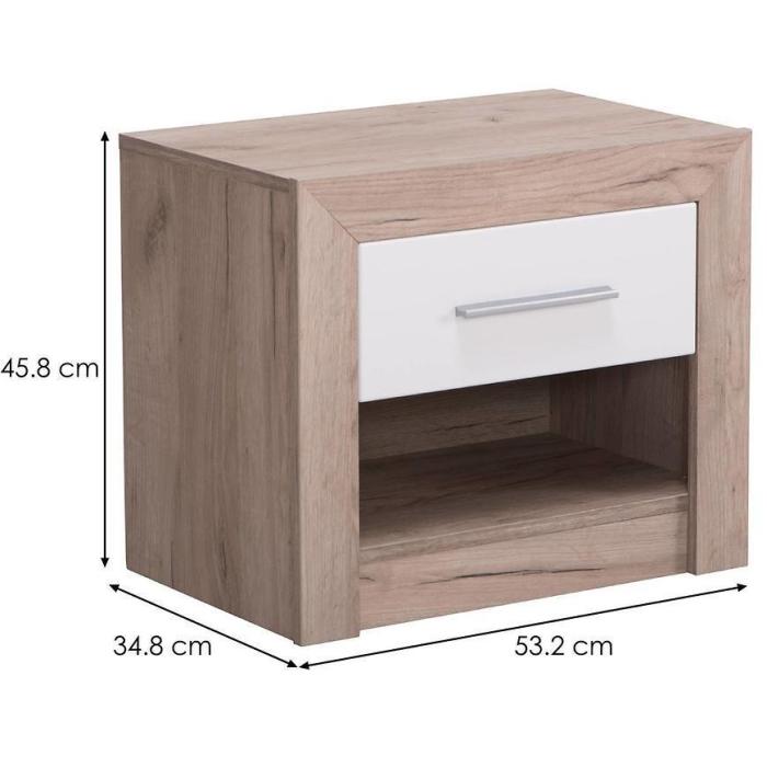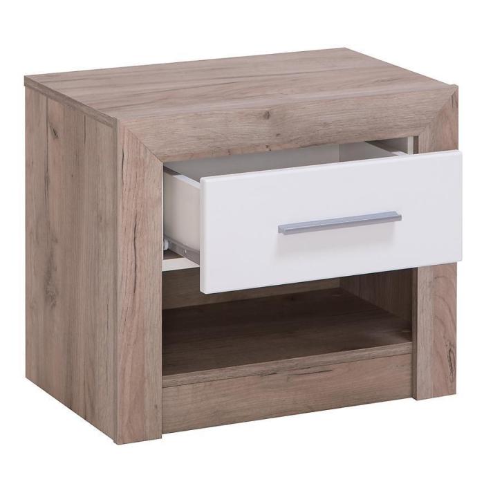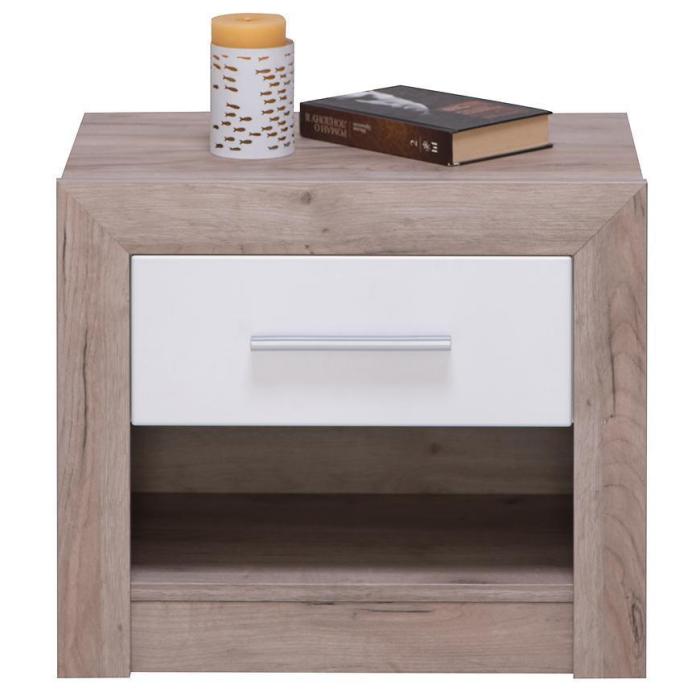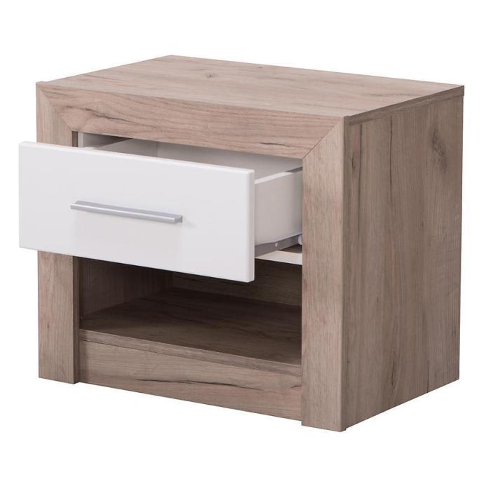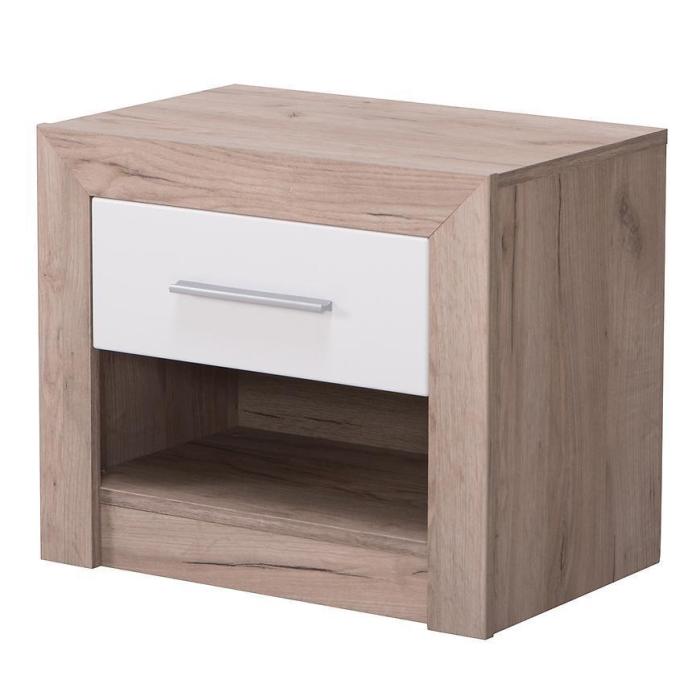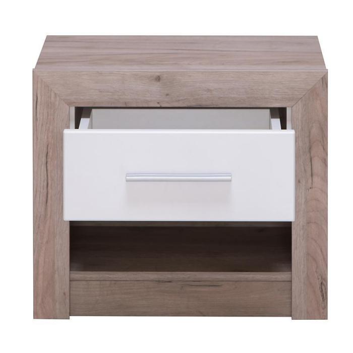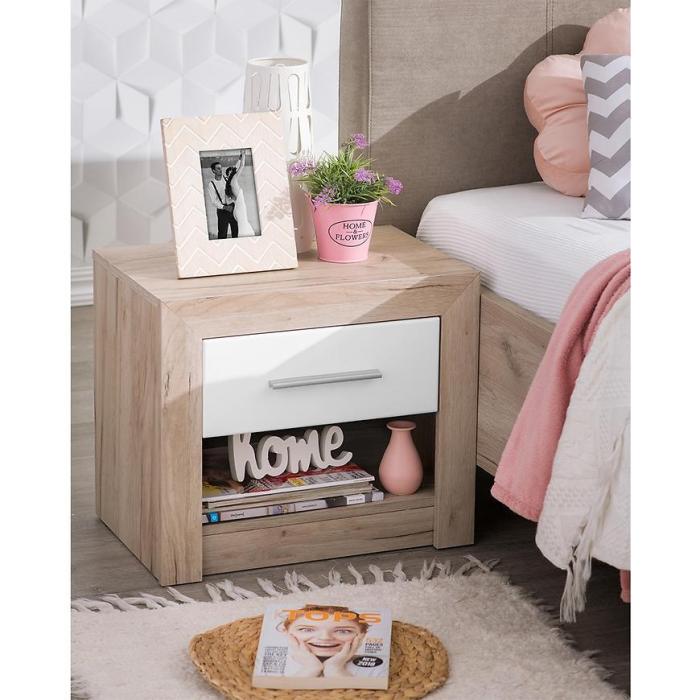 Szafka nocna Astor to mebel w nowoczesnym stylu, który wykonany został z płyty wiórowej laminowanej. Stolik posiada szufladę do której można włożyć drobiazgi. Stolik ma nieduże rozmiary więc zmieści się nawet w małej sypialni. Będzie pasował również w innych pomieszczeniach.