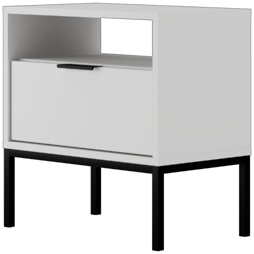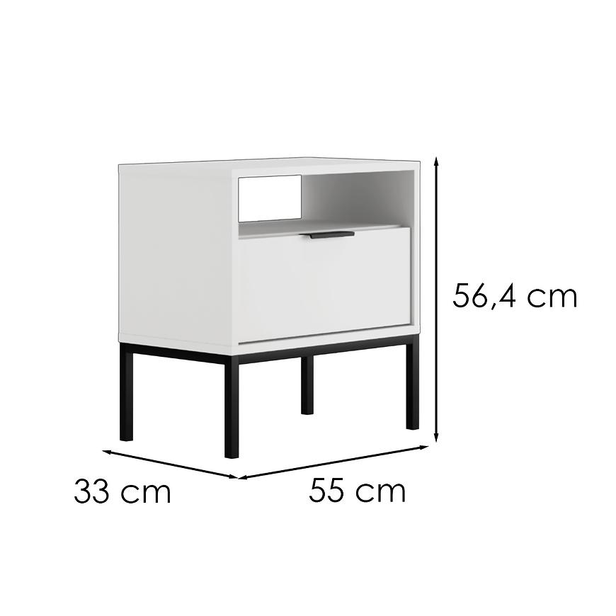 Szafka nocna Austin biały/czarny to stylowy i praktyczny dodatek do nowoczesnej sypialni. Wykonana z laminowanej płyty wiórowej, utrzymana w białym, matowym wykończeniu, idealnie komponuje się z innymi meblami z kolekcji AUSTIN. Mebel o wymiarach 55 × 56,4 × 33 cm oferuje jedną pojemną szufladę, idealną na drobiazgi. Lekka konstrukcja (14,2 kg) oraz prosta forma sprawiają, że szafka doskonale sprawdzi się przy łóżku, zapewniając funkcjonalność i estetykę. Wymaga samodzielnego montażu.