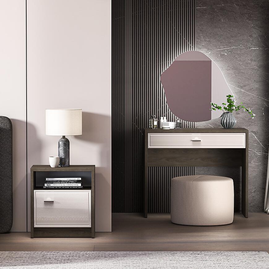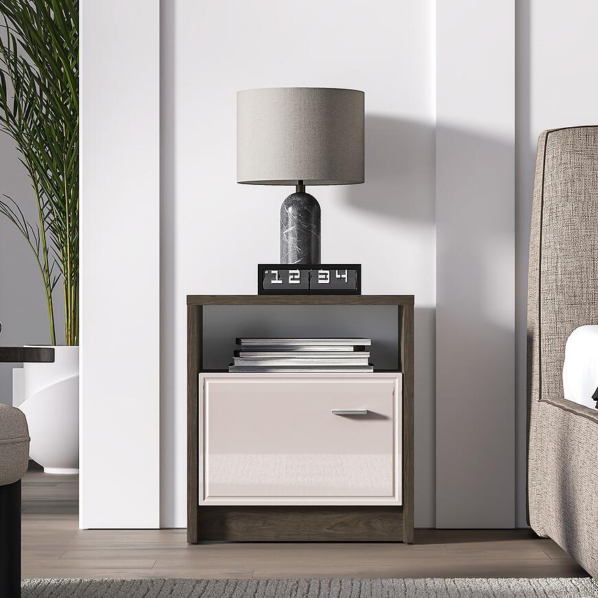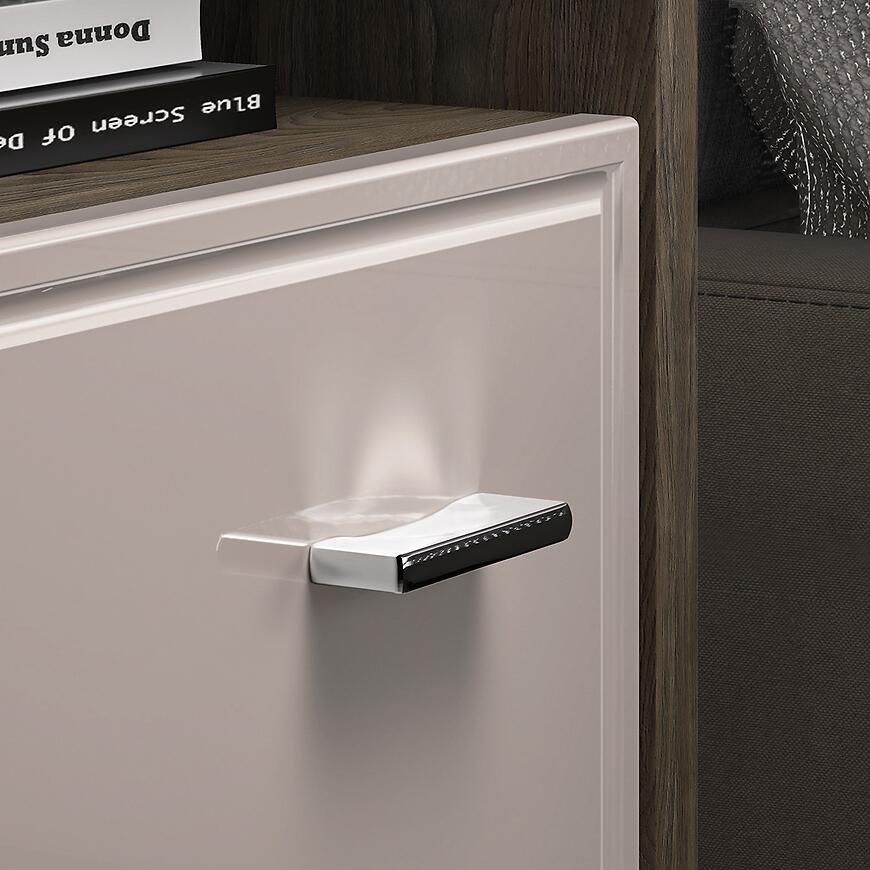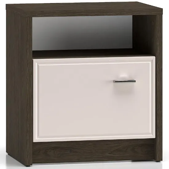 Szafka nocna Avante to elegancki i praktyczny dodatek do sypialni, który łączy klasyczny styl z nowoczesnym wykończeniem. Front w kolorze cashmere o wysokim połysku zestawiony został z korpusem w dekorze dąb windmill dark wykończonym matem, co nadaje bryle wyjątkowego charakteru i ponadczasowej elegancji.
