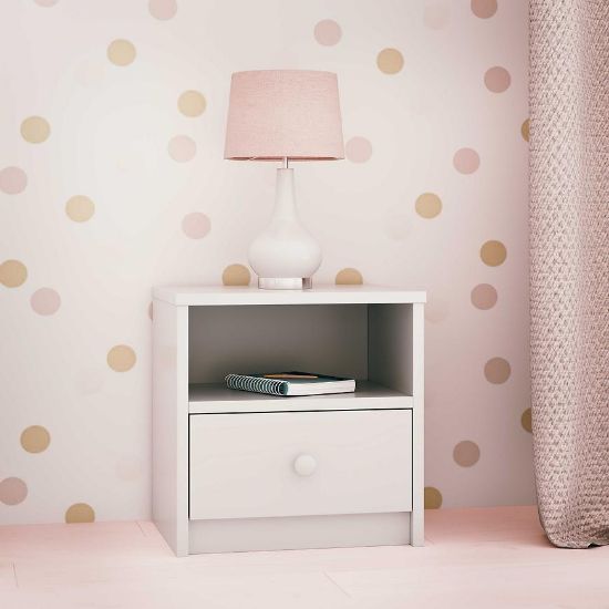 Szafka Nocna Babydreams w kolorze białym to niezwykle praktyczny i stylowy element wyposażenia pokoju dziecięcego. Jej konstrukcja oparta jest na solidnej płycie wiórowej laminowanej, co gwarantuje trwałość oraz odporność na codzienne użytkowanie. Matowe wykończenie nadaje meblowi eleganckiego charakteru, jednocześnie tworząc subtelny i przyjemny w dotyku efekt.