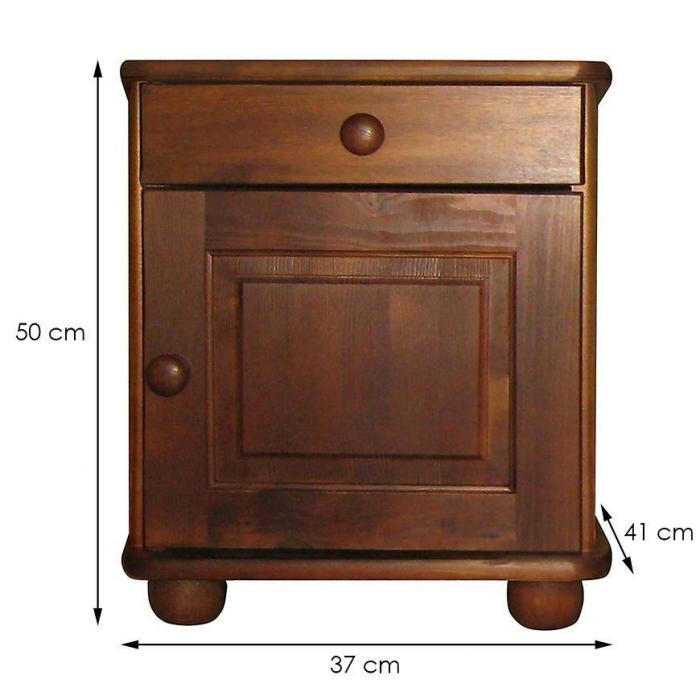 Konstrukcja szafki jest stabilna i wytrzymała. Materiał wykonania to drewno w kolorze brązu. Szafka nocna posiada jedną szufladę i jedną zamykana szafkę, w której można umieścić najpotrzebniejsze rzeczy.