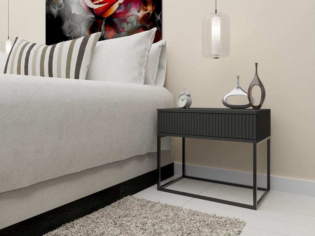 Umieszczona na metalowym, czarnym stelażu, szafka Cadro 2 prezentuje się nowocześnie i stylowo, nadając Twojej sypialni wyjątkowy charakter. Jej korpus wykonany jest z wysokiej jakości płyty laminowanej, co gwarantuje trwałość i odporność na uszkodzenia.