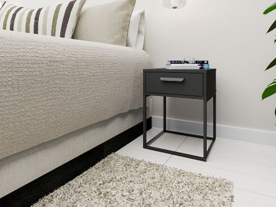 Posiada jedną szufladę, która pozwala na przechowywanie różnorodnych drobiazgów czy przedmiotów osobistych. Maksymalne dopuszczalne obciążenie szuflady wynosi 5 kg, co zapewnia bezpieczne i stabilne użytkowanie. Uchwyt szuflady wykonany jest z trwałego tworzywa sztucznego w kolorze czarnym, co dodaje szafce elegancji i nowoczesności.
