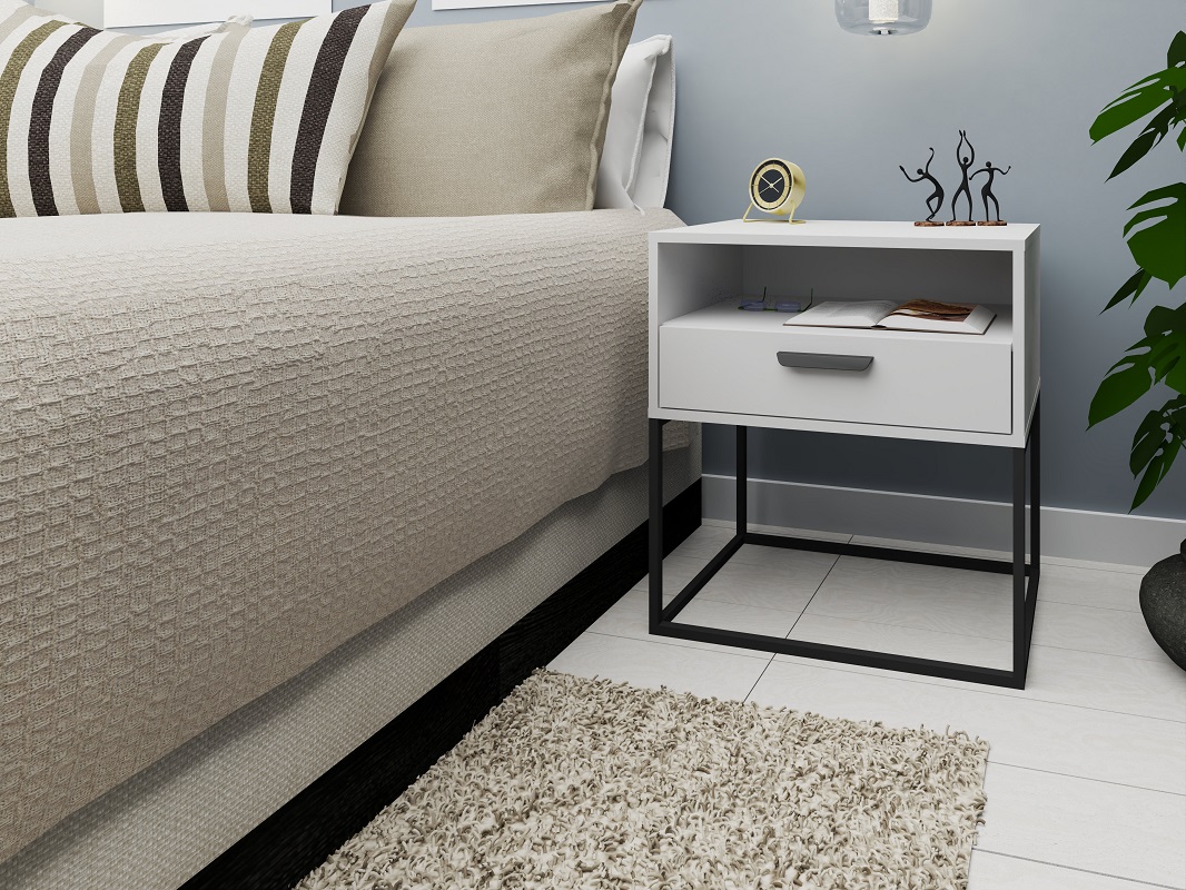 Posiada jedną szufladę oraz jedną półkę pod blatem, co pozwala na wygodne przechowywanie różnorodnych przedmiotów, od książek i magazynów po lampkę nocną czy inne drobiazgi. Maksymalne dopuszczalne obciążenie szuflady wynosi 5 kg, zapewniając stabilność i bezpieczeństwo użytkowania. Uchwyt szuflady wykonany jest z trwałego tworzywa sztucznego w kolorze czarnym, co nadaje szafce elegancki i nowoczesny wygląd.