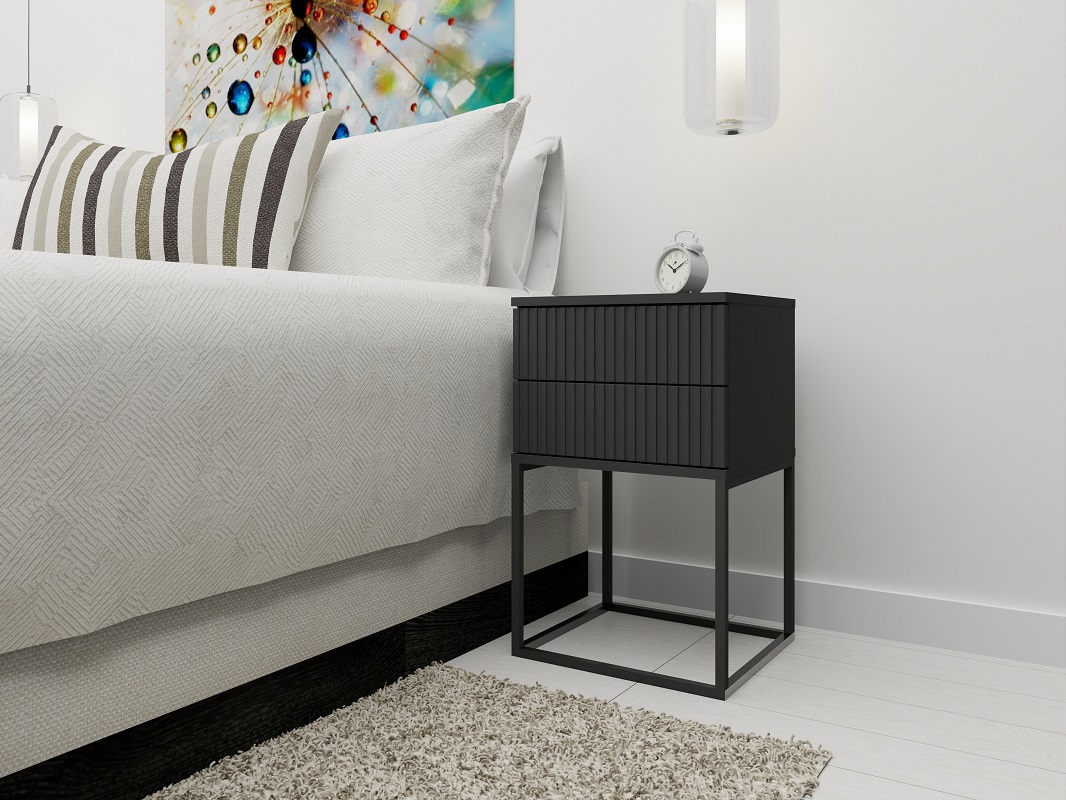 Umieszczona na metalowym, czarnym stelażu, szafka Cadro 8 prezentuje się nowocześnie i stylowo, nadając Twojej sypialni wyjątkowy charakter. Jej korpus wykonany jest z wysokiej jakości płyty laminowanej, co gwarantuje trwałość i odporność na uszkodzenia.