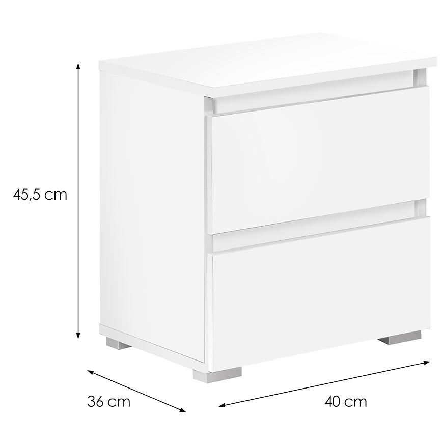 Model wyposażony jest w dwie szuflady, które pozwalają wygodnie przechowywać najpotrzebniejsze przedmioty, takie jak książki, ładowarki czy akcesoria nocne. Kompaktowe wymiary sprawiają, że szafka dobrze sprawdza się nawet w mniejszych pomieszczeniach.