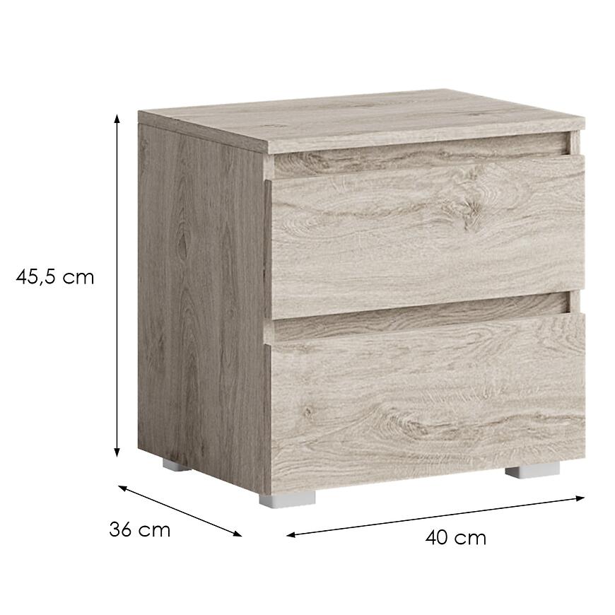 Model Cosmo Dąb Oslo wyposażony jest w dwie pojemne szuflady, które umożliwiają uporządkowanie książek, ładowarek, okularów czy innych akcesoriów sypialnianych. Szuflady zapewniają łatwy dostęp do zawartości i pomagają zachować porządek w strefie nocnej. Szafka nocna z szufladami to rozwiązanie, które docenią osoby ceniące estetykę oraz dobrze zorganizowaną przestrzeń. Brak oświetlenia pozwala zachować prostą, czystą formę, idealnie wpisującą się w nowoczesne aranżacje.