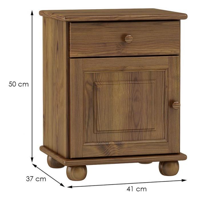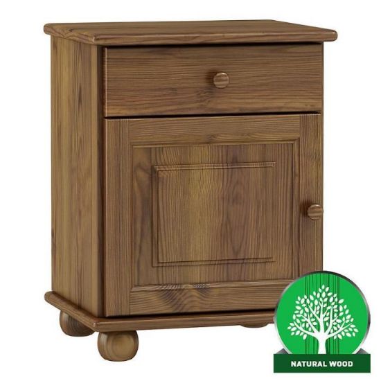 Konstrukcja szafki jest stabilna i wytrzymała. Materiał wykonania to drewno w kolorze dębu. Szafka nocna posiada jedną szufladę i jedną zamykana szafkę, w której można umieścić najpotrzebniejsze rzeczy.