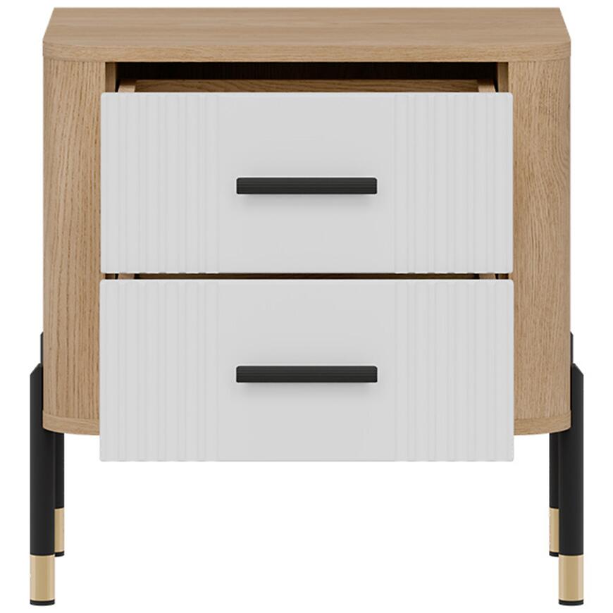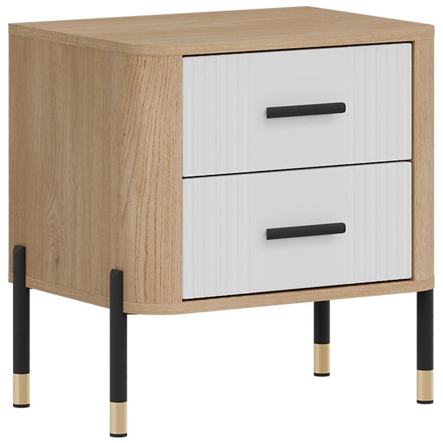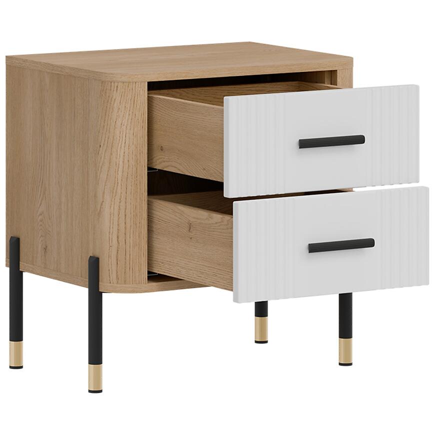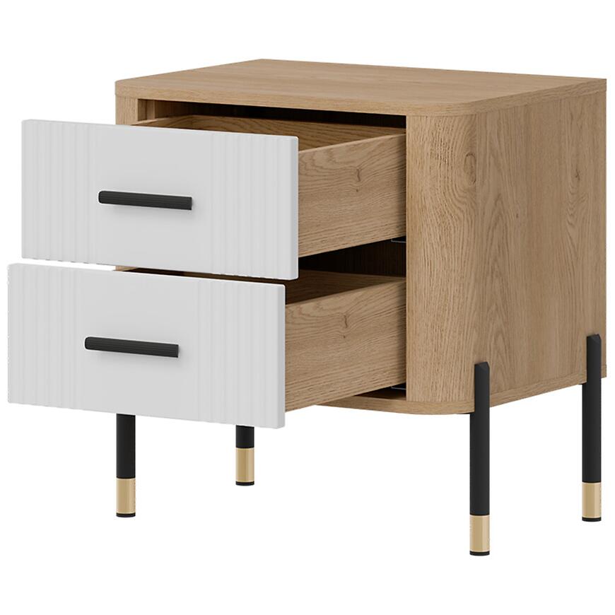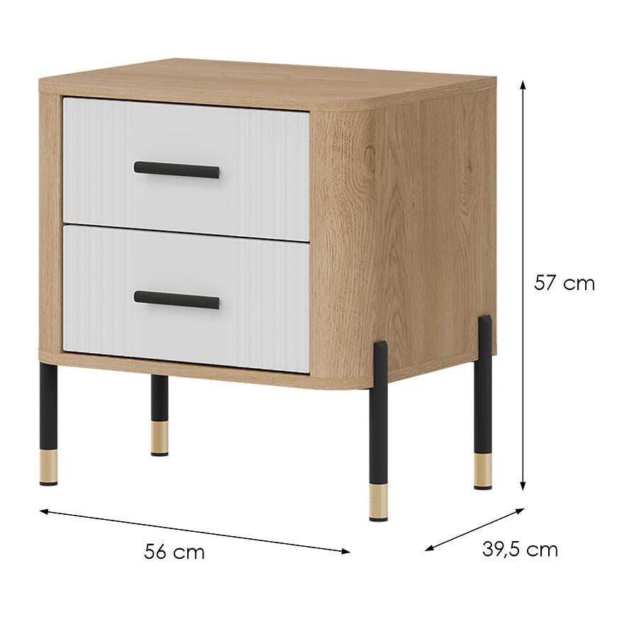 Szafka ma szerokość 56 cm, wysokość 57 cm oraz głębokość 39,5 cm, dzięki czemu idealnie sprawdzi się przy łóżku, nie zajmując zbyt wiele miejsca. Dwie pojemne szuflady umożliwiają przechowywanie najpotrzebniejszych przedmiotów, takich jak książka, telefon, okulary czy drobne akcesoria, pomagając utrzymać porządek w sypialni.