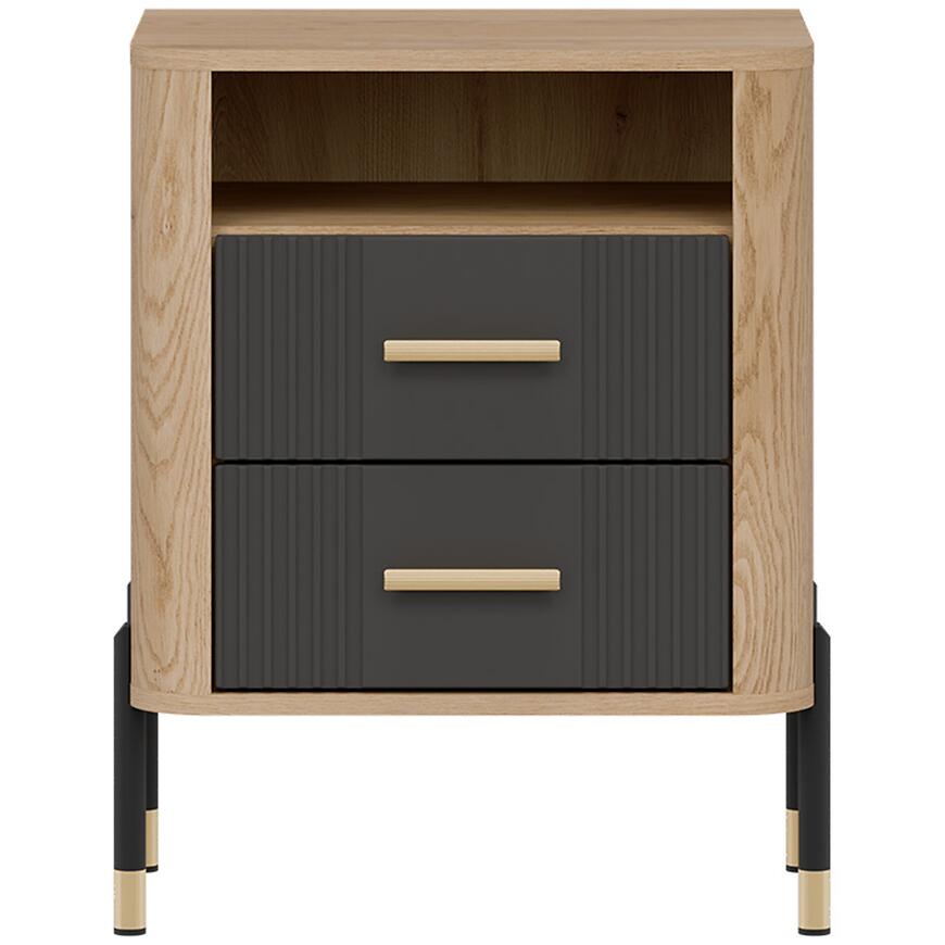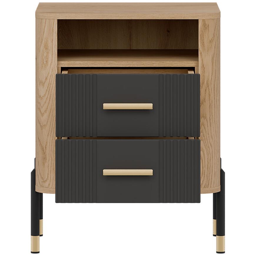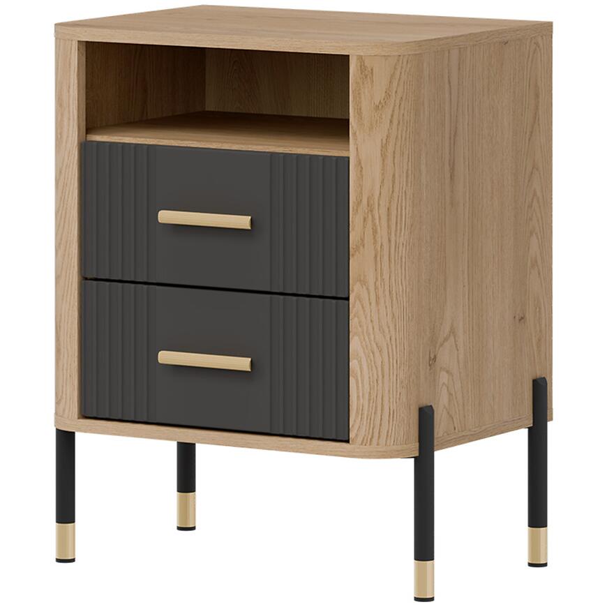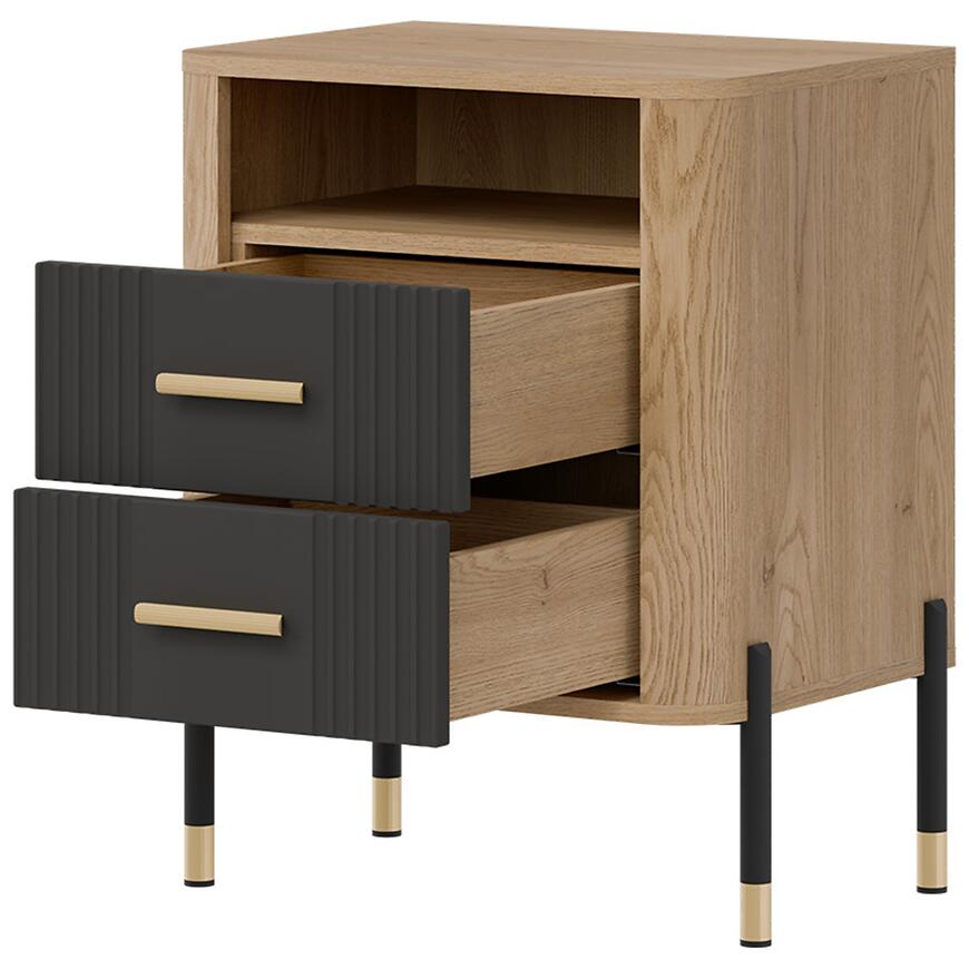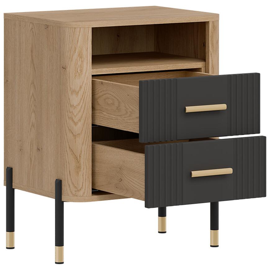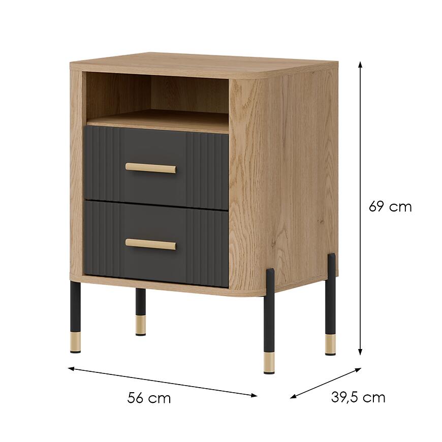 Mebel ma szerokość 56 cm, wysokość 69 cm oraz głębokość 39,5 cm, co sprawia, że idealnie pasuje do ustawienia przy łóżku. Dwie pojemne szuflady pozwalają na przechowywanie niezbędnych drobiazgów, takich jak książki, lampka nocna, okulary czy ładowarki, zapewniając porządek w sypialni.