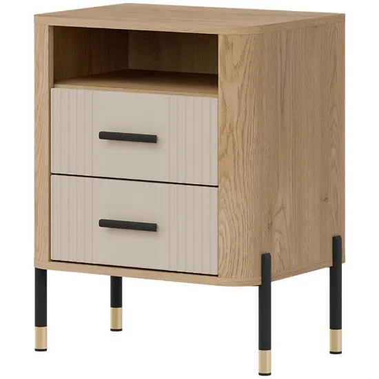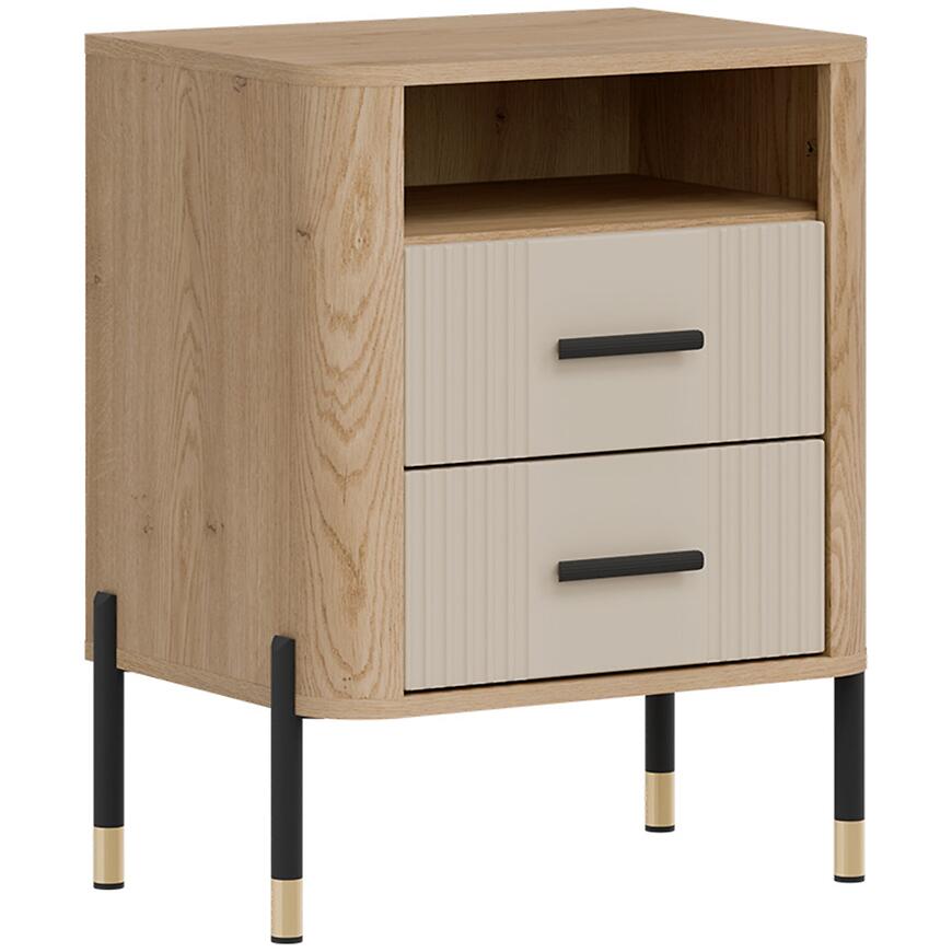 Szafka nocna Dante Dt22 w kolorze Kaszmir to mebel łączący nowoczesny design z praktycznym zastosowaniem. Jasny korpus w odcieniu dąb Cremona kontrastuje z matowymi, beżowymi frontami, tworząc subtelną i uniwersalną kompozycję pasującą do wielu aranżacji wnętrz.