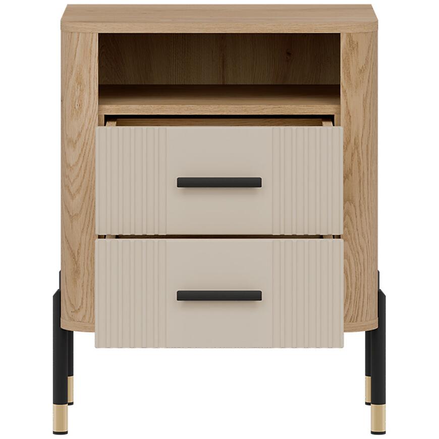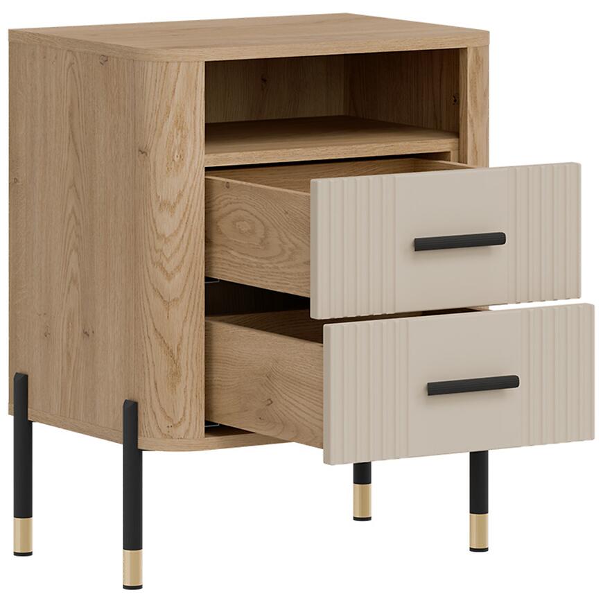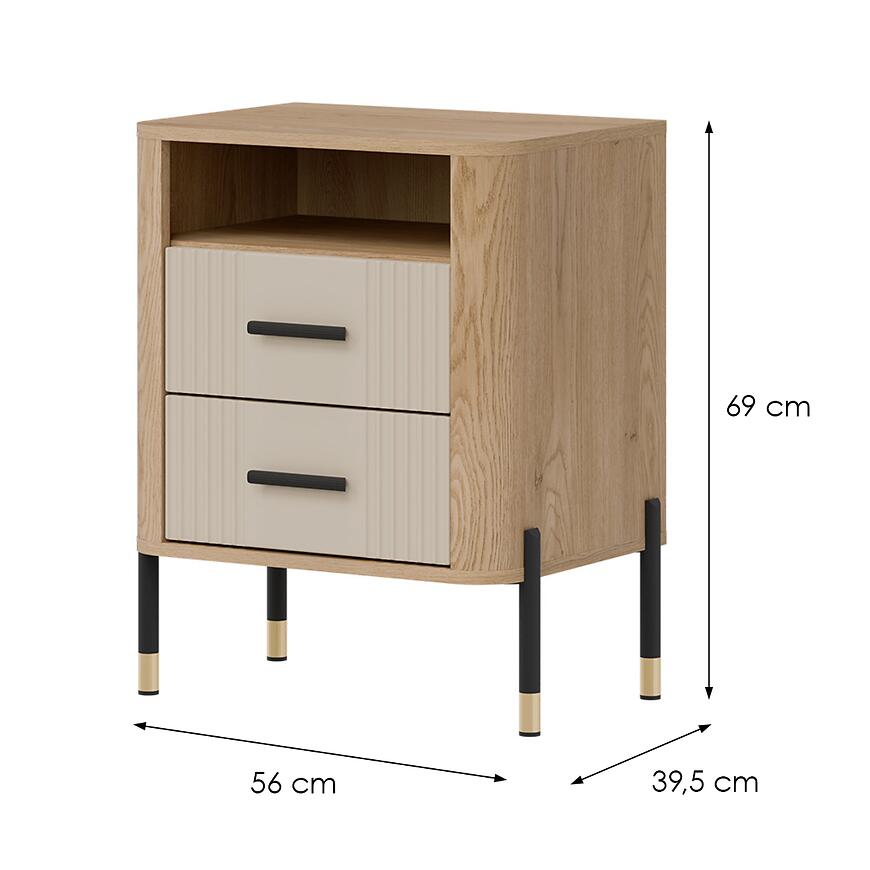 Szafka ma szerokość 56 cm, wysokość 69 cm oraz głębokość 39,5 cm. Wyposażona jest w dwie przestronne szuflady, które umożliwiają wygodne przechowywanie drobiazgów, takich jak książki, lampka nocna, czy akcesoria codziennego użytku, pomagając utrzymać porządek w sypialni.