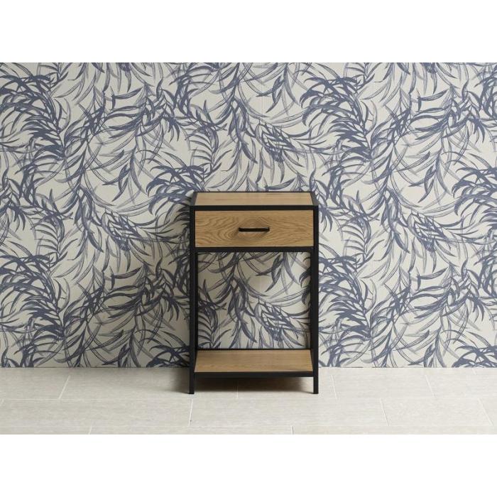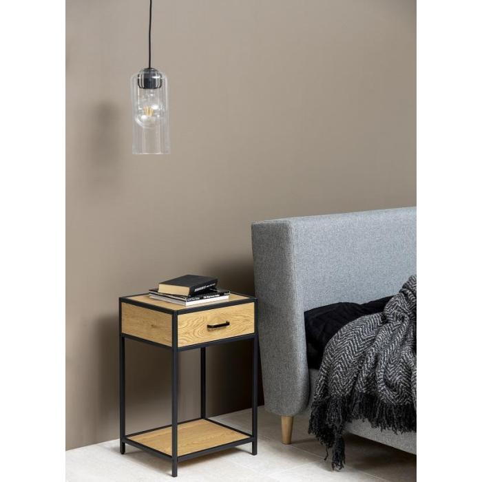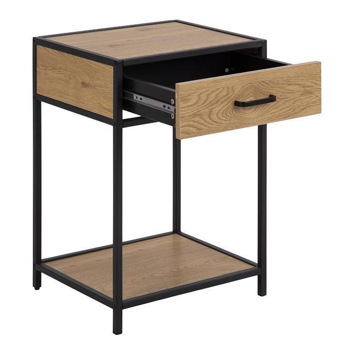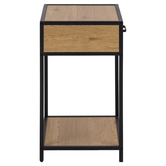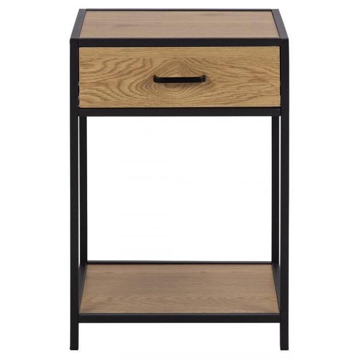 Szafka nocna Eri to funkcjonalny i praktyczny mebel. Wymiary szafki pozwalają na umieszczenie jej w większości aranżacji, zmieści się nawet w małej sypialni. Szafka posiada metalowy szkielet, który został pomalowany proszkowo na czarny kolor. Półka, górny blat oraz szuflada zostały wykonane z płyty MDF. Blat, dolna półka oraz szuflada zapewniają dodatkowe miejsce do przechowywania Twoich książek, okularów, telefonu czy lampki nocnej.