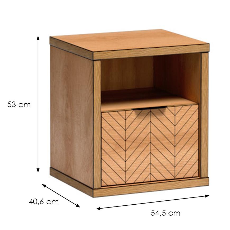 Szafka nocna Fonti w kolorze dąb karmel, o wymiarach 47 cm szerokości, 53 cm wysokości oraz 40,6 cm głębokości, to praktyczne i nowoczesne rozwiązanie do przechowywania, które doskonale wpasuje się w różnorodne wnętrza.