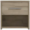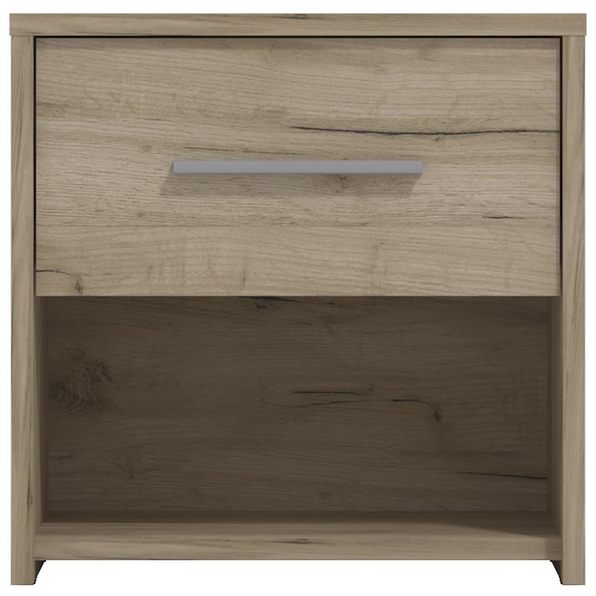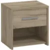 Szafka nocna z kolekcji Garona w kolorze szary dąb to doskonałe połączenie funkcjonalności i nowoczesnego designu, które idealnie dopełni aranżację każdej sypialni. Wykonana z płyty wiórowej laminowanej, cechuje się wysoką odpornością na uszkodzenia mechaniczne i łatwością w utrzymaniu czystości. Matowe wykończenie nadaje meblowi elegancki i subtelny charakter, doskonale wpisujący się w modne, minimalistyczne wnętrza.