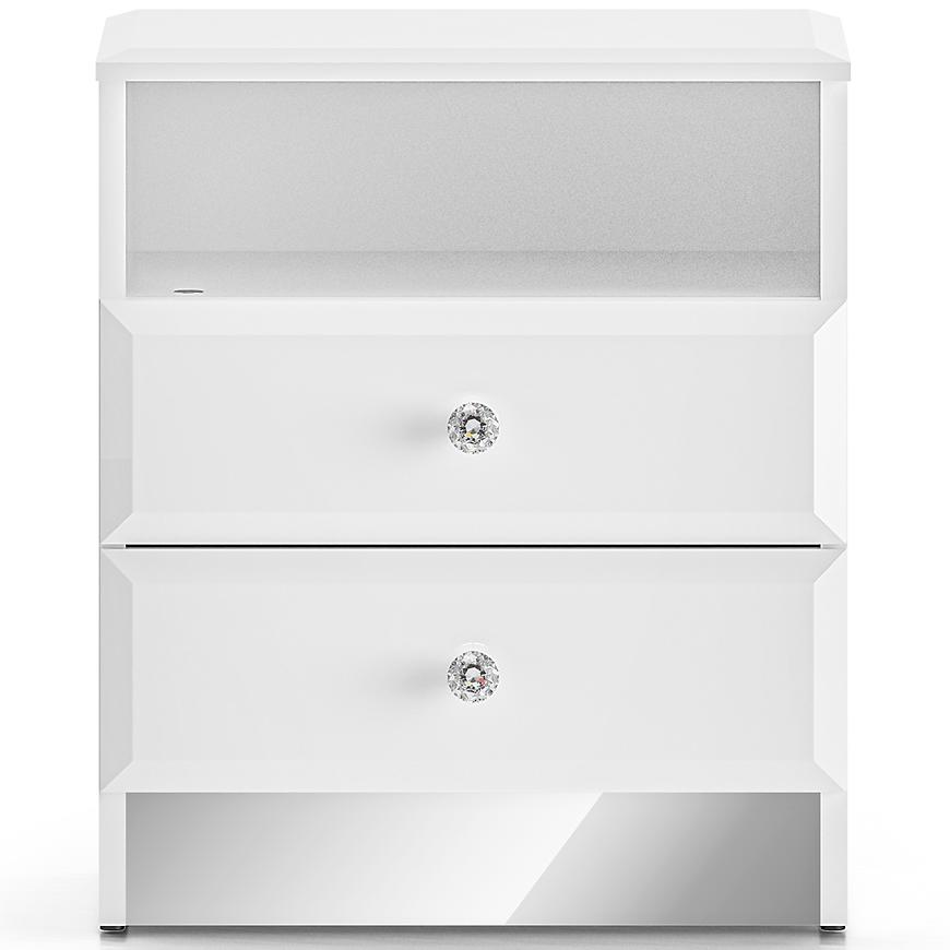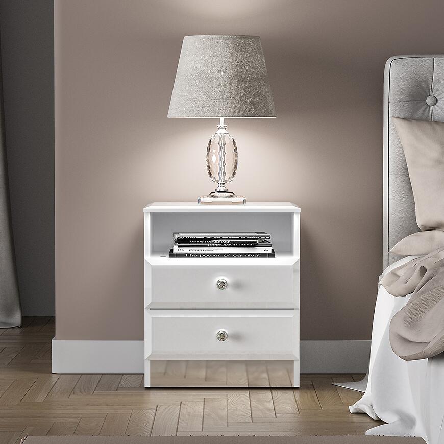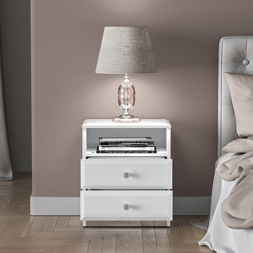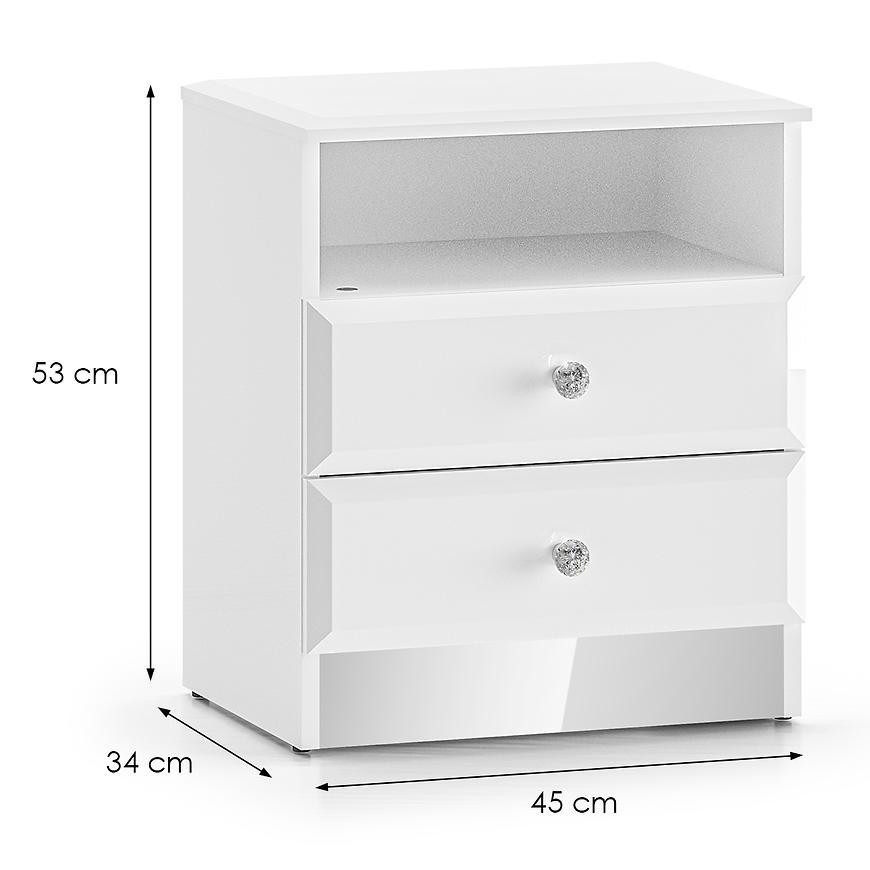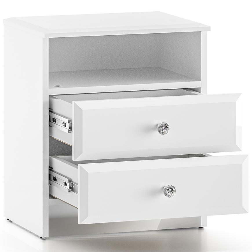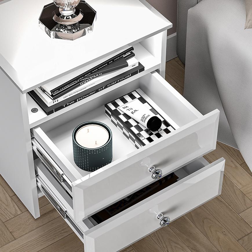Szafka nocna Glamour z dwiema szufladami to elegancki dodatek do sypialni, który łączy w sobie nowoczesny styl i wygodę codziennego użytkowania. Białe, połyskujące fronty wykonane z płyty MDF pięknie odbijają światło, dzięki czemu wnętrze staje się jaśniejsze i bardziej przestronne. Szafka wyposażona została w dwie pojemne szuflady, które pomieszczą niezbędne drobiazgi – książki, akcesoria czy kosmetyki. Jej kompaktowa forma sprawia, że idealnie komponuje się zarówno z łóżkiem w jasnych, jak i ciemnych barwach, tworząc spójną aranżację sypialni.