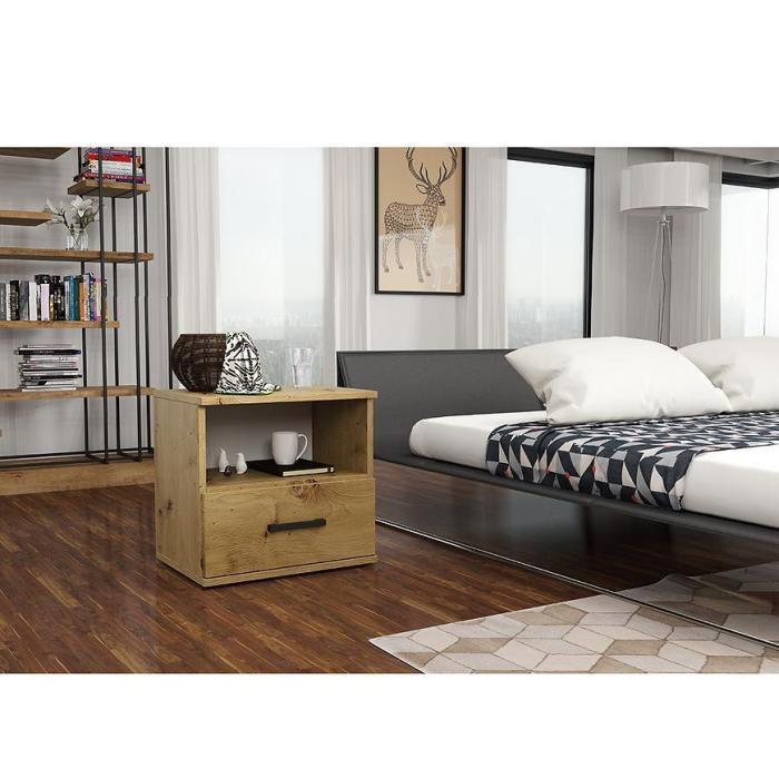 Konstrukcja szafki jest stabilna i wytrzymała. Materiał wykonania to płyta wiórowa laminowana w kolorze artisan. Szafka z pewnością znajdzie swoje zastosowanie w sypialni.
