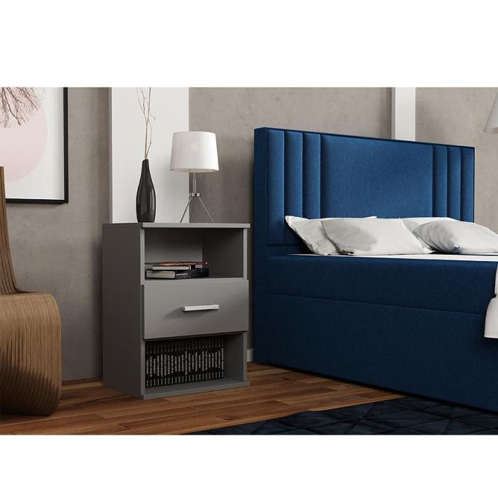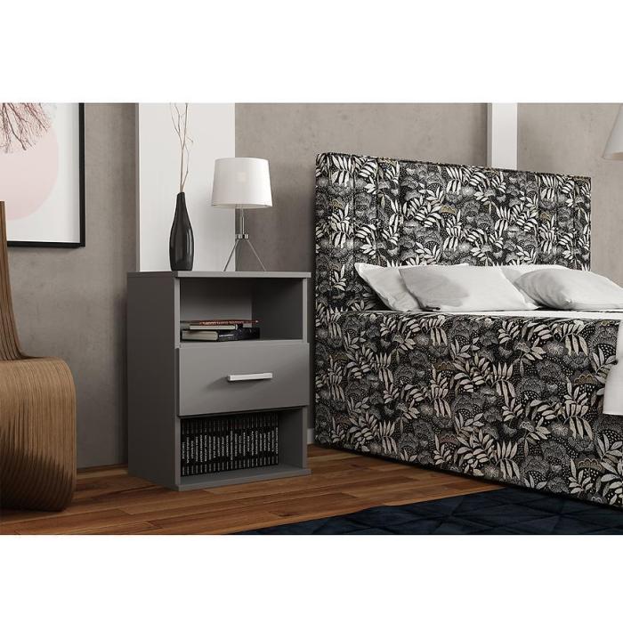 Konstrukcja szafki jest stabilna i wytrzymała. Materiał wykonania to płyta wiórowa laminowana w kolorze grafit. Szafka z pewnością znajdzie swoje zastosowanie w sypialni.