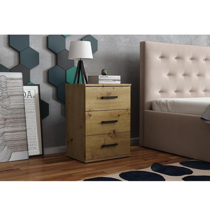 Konstrukcja szafki jest stabilna i wytrzymała. Materiał wykonania to płyta wiórowa laminowana w kolorze artisan. Szafka z pewnością znajdzie swoje zastosowanie w sypialni.