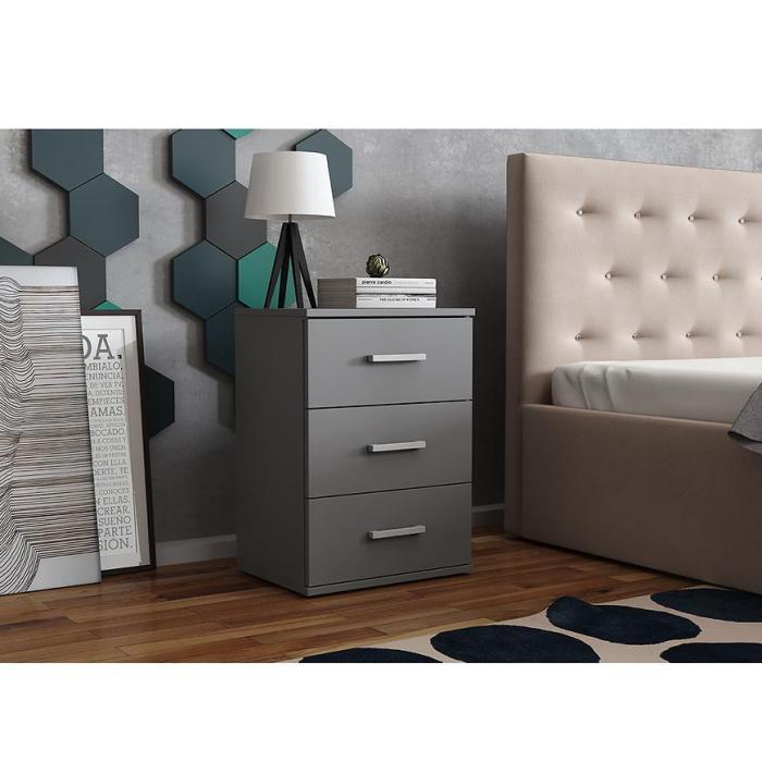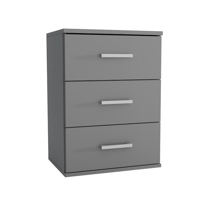 Konstrukcja szafki jest stabilna i wytrzymała. Materiał wykonania to płyta wiórowa laminowana w kolorze grafit. Szafka z pewnością znajdzie swoje zastosowanie w sypialni.