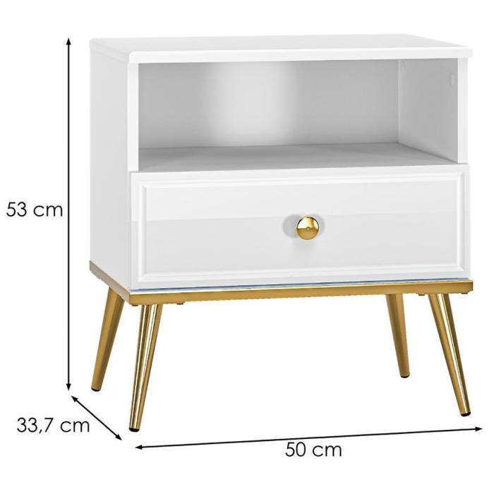 Szafka nocna z kolekcji Goldin to niezbędny element wyposażenia każdej sypialni. Stolik świetnie sprawdzi się obok łóżka. Może służyć do przechowywania rzeczy, ale również jako dekoracja. Jest stabilny i wytrzymały. Został wykonany z płyty wiórowej laminowanej w kolorze biały połysk.