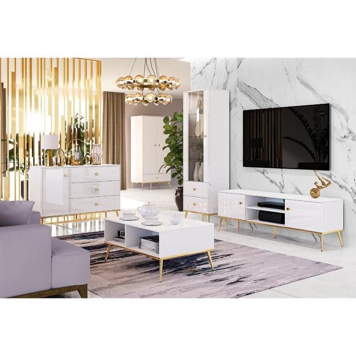 Kolekcja mebli do pokoju dziennego Goldin zachwyca swoim nowoczesnym stylem i wysoką jakością wykonania. Wszystkie elementy tej kolekcji są wykonane z trwałej płyty wiórowej laminowanej, co gwarantuje długotrwałą wytrzymałość mebli. Ich dekor w kolorze białym, wzbogacony elementami w złotym kolorze, dodaje elegancji i prestiżu każdemu pomieszczeniu. Fronty oraz korpusy mebli zostały wykończone w błyszczącym stylu, co nadaje całości niepowtarzalnego blasku i dodaje elegancji wnętrzu. Każdy element kolekcji Goldin został starannie zaprojektowany, aby dostarczyć zarówno funkcjonalność, jak i estetykę, co sprawia, że pokoje dziennego stają się wyjątkowymi miejscami do wypoczynku i spędzania czasu z bliskimi.