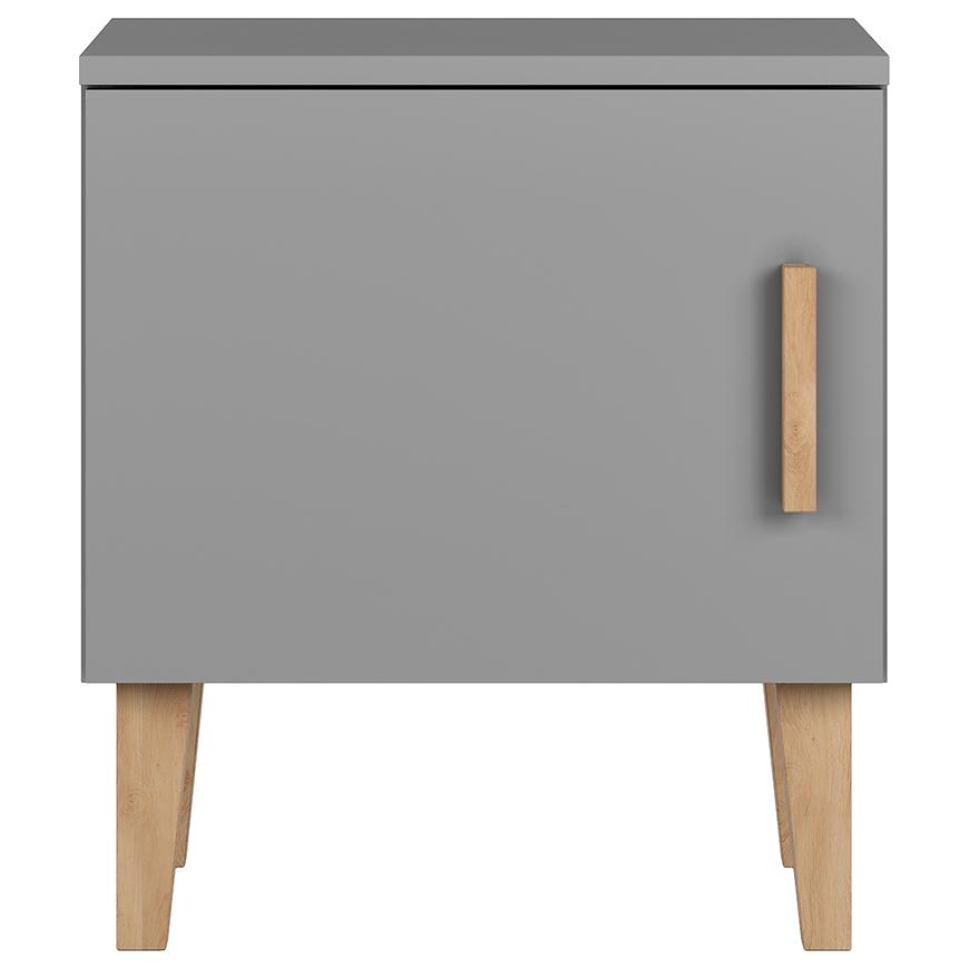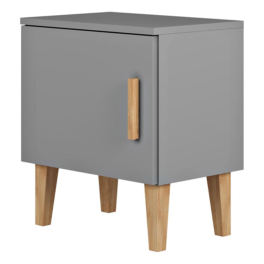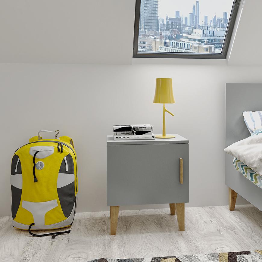 Korpus szafki nocnej, również wykonany z płyty wiórowej laminowanej, jest jednolity w kolorze szarym, co nadaje mu lekkości i sprawia, że łatwo komponuje się z różnymi aranżacjami pokoju dziecięcego czy młodzieżowego.