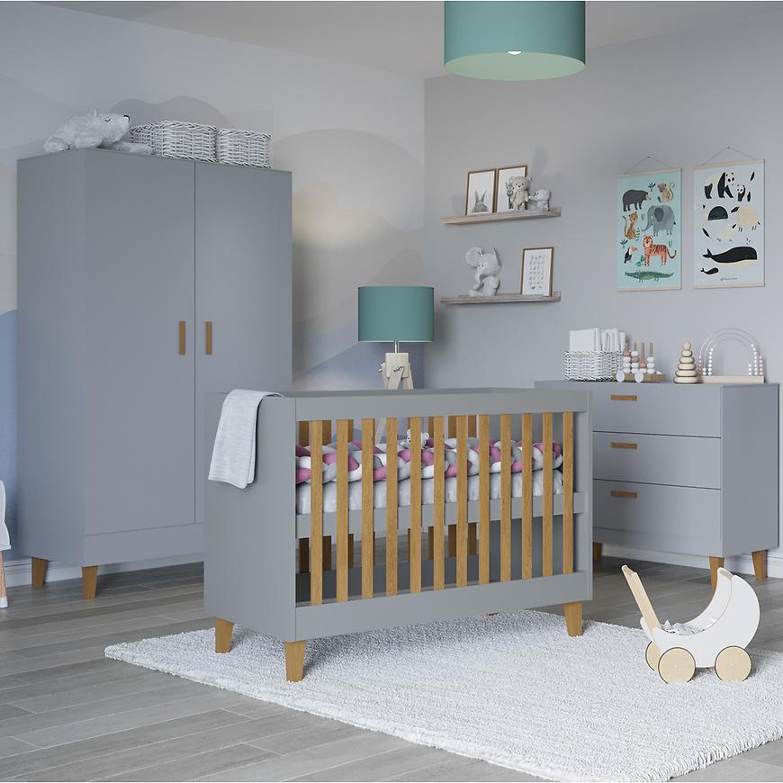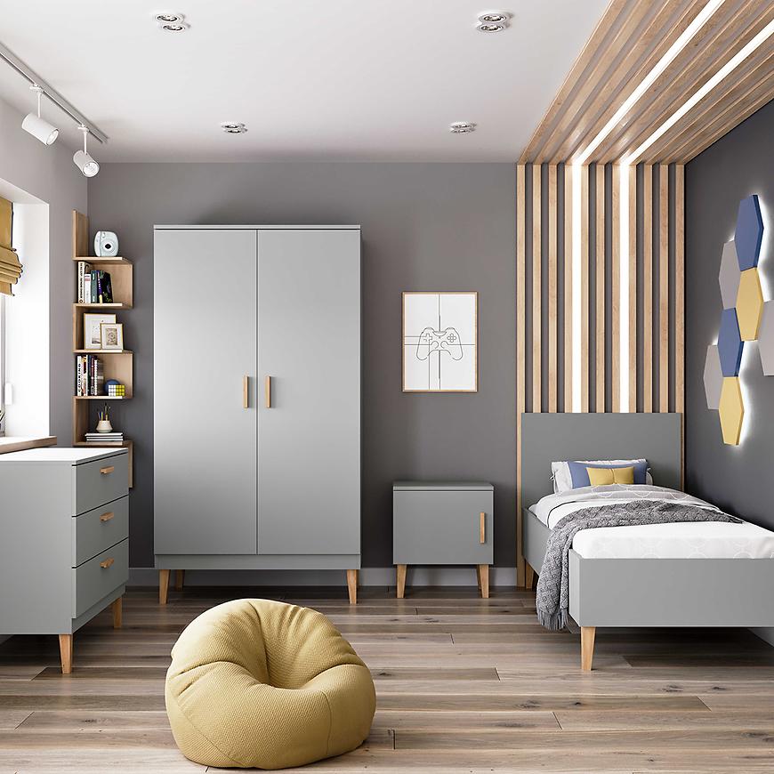 Dwudrzwiowa szafa to centralny element kolekcji, oferujący pojemną przestrzeń do przechowywania ubrań i innych przedmiotów. Drzwi uchylne ułatwiają korzystanie z szafy, a praktyczne wnętrze zapewnia porządek. Komoda z trzema szufladami to doskonałe rozwiązanie na przechowywanie drobiazgów, jednocześnie stanowiąc elegancką ozdobę pokoju.