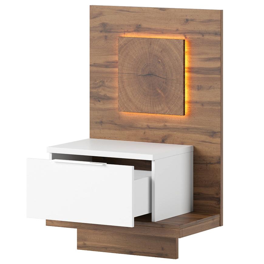 Szafka nocna Livorno lewostronna w kolorze dąb wotan z białymi akcentami to elegancki i funkcjonalny dodatek do każdej sypialni. Wykonana z wysokiej jakości płyty wiórowej laminowanej, ta nowoczesna szafka nocna oferuje trwałość i łatwość w utrzymaniu. Matowe wykończenie oraz minimalistyczny design w połączeniu z ciepłymi odcieniami dębu wotan i świeżym białym kolorem frontu nadają jej stylowy i nowoczesny wygląd.
