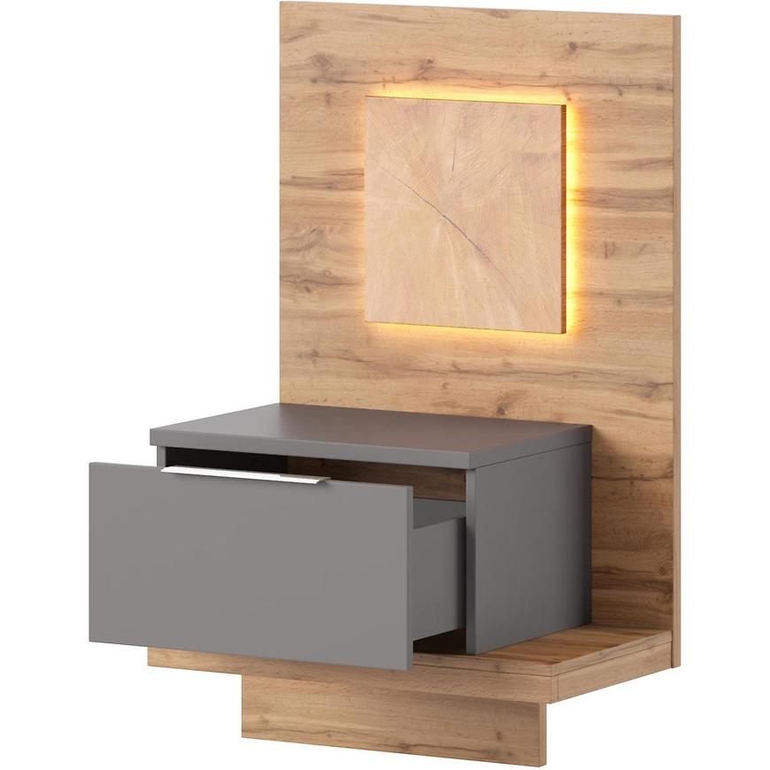 Szafka nocna Livorno lewostronna w kolorze dąb wotan z szarymi akcentami to elegancki i funkcjonalny dodatek do każdej sypialni. Wykonana z wysokiej jakości płyty wiórowej laminowanej, ta nowoczesna szafka nocna oferuje trwałość i łatwość w utrzymaniu. Matowe wykończenie oraz minimalistyczny design w połączeniu z ciepłymi odcieniami dębu wotan i szarym bazaltowym kolorem frontu nadają jej stylowy i nowoczesny wygląd.