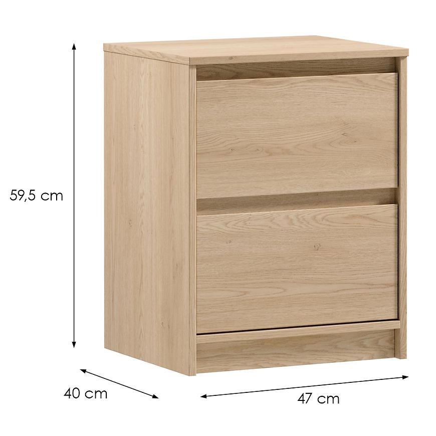 Blat szafki w klasycznym kształcie prostokąta pozwala na ustawienie lampki nocnej, budzika czy dekoracji. Wymiary 47x40x59,5 cm sprawiają, że szafka jest stabilna, a jednocześnie nie zajmuje dużo miejsca w sypialni.