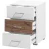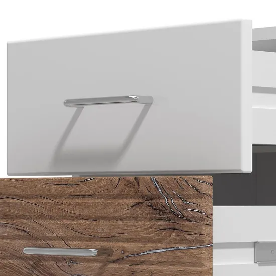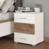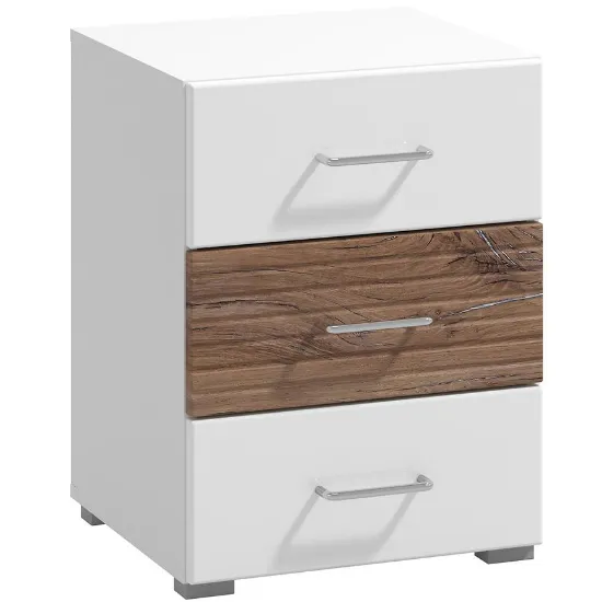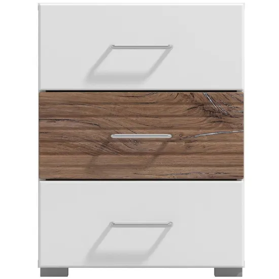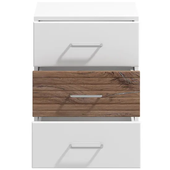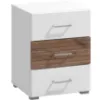 Szafka nocna w kolorze biały/dąb to doskonałe połączenie funkcjonalności i nowoczesnego designu, które idealnie dopełni aranżację każdej sypialni. Wykonana z płyty wiórowej laminowanej, cechuje się wysoką odpornością na uszkodzenia mechaniczne i łatwością w utrzymaniu czystości. Matowe wykończenie nadaje meblowi elegancki i subtelny charakter, doskonale wpisujący się w modne, minimalistyczne wnętrza.