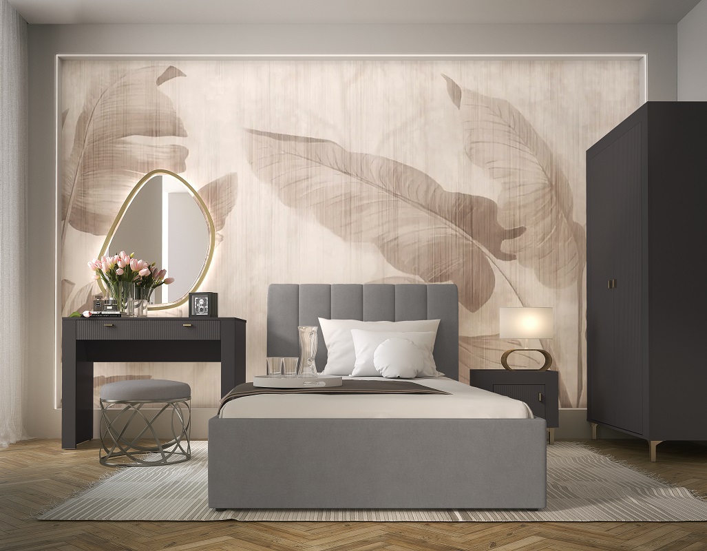 Kolekcja Mossa oferuje szeroki wybór mebli, które doskonale sprawdzą się w każdej sypialni. W jej skład wchodzą toaletka, szafka nocna, szafy dwudrzwiowe i trzydrzwiowe (w tym jedna z lustrem), a także tapicerowane łóżka o szerokości 120 cm lub 160 cm. Łóżka dostępne są w dwóch modnych kolorach – beżowym i popielatym, a w komplecie znajdują się stelaże. Do łóżek należy dokupić materac, co pozwala na pełne dostosowanie sypialni do własnych preferencji.