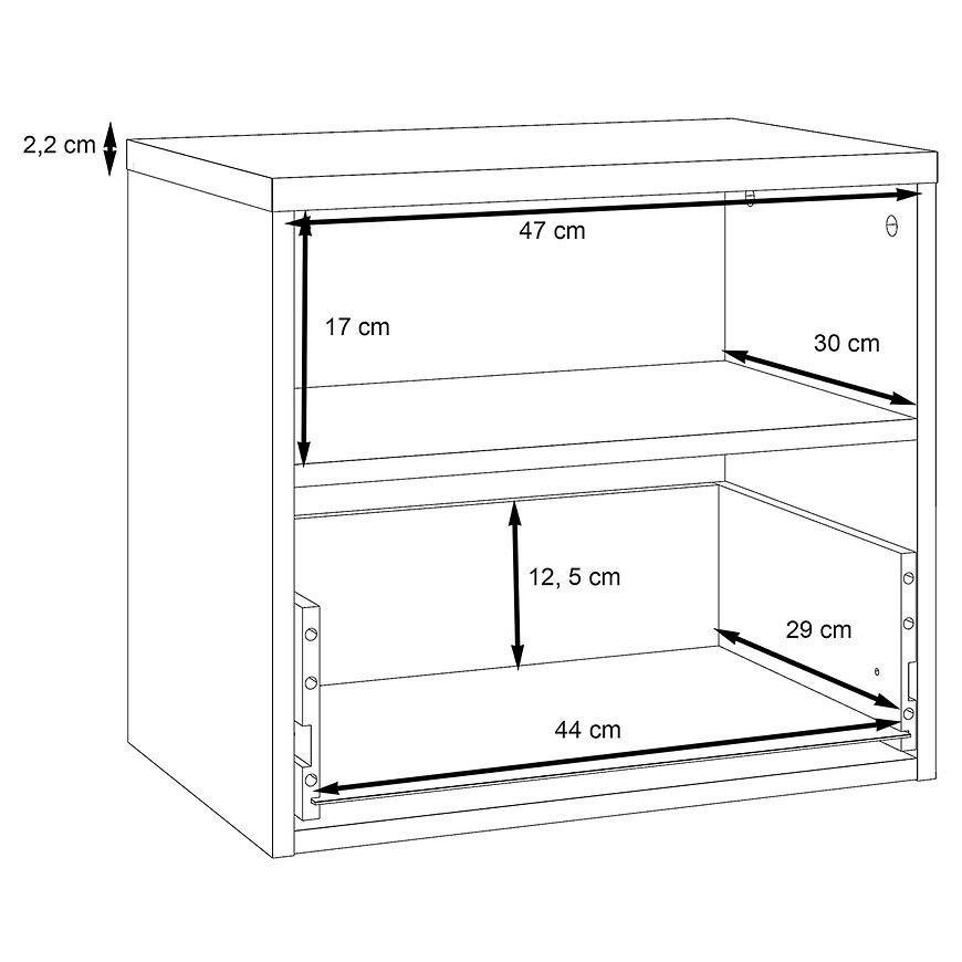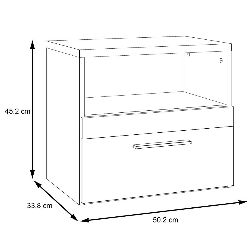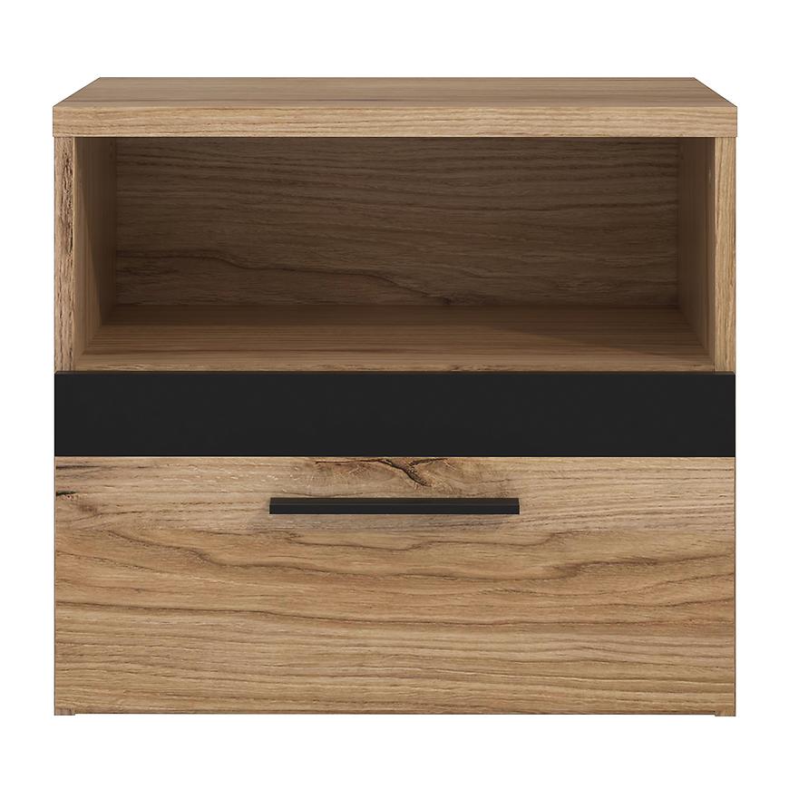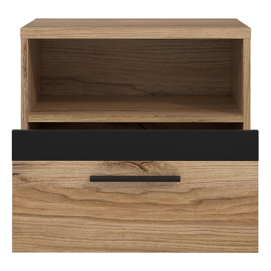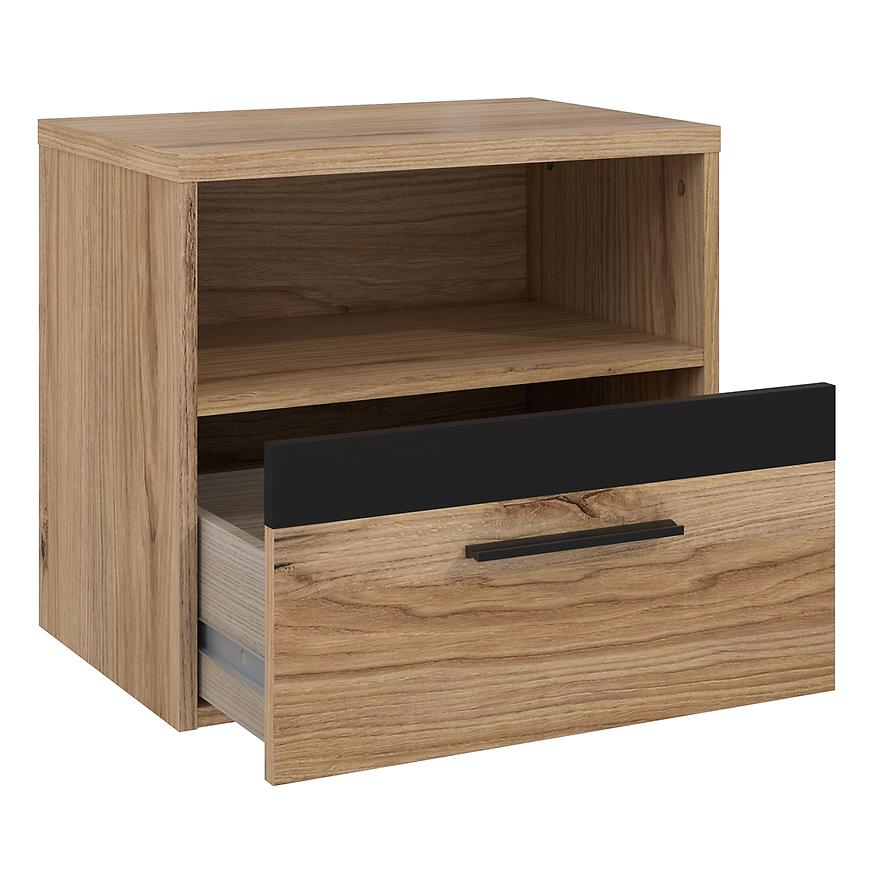 Dekor w odcieniu dąb catania z elementami w czarnym kolorze nadaje meblom niezwykłego charakteru. Fronty i korpusy mebli zostały wykończone matowym lakierem, co nadaje im delikatnego wyglądu i zapewnia trwałość. Ten minimalistyczny, ale stylowy wybór pozwala na łatwe wkomponowanie mebli Nemezy w różne aranżacje wnętrz sypialni.