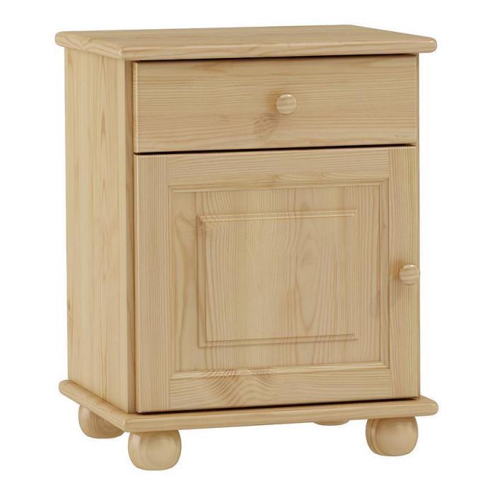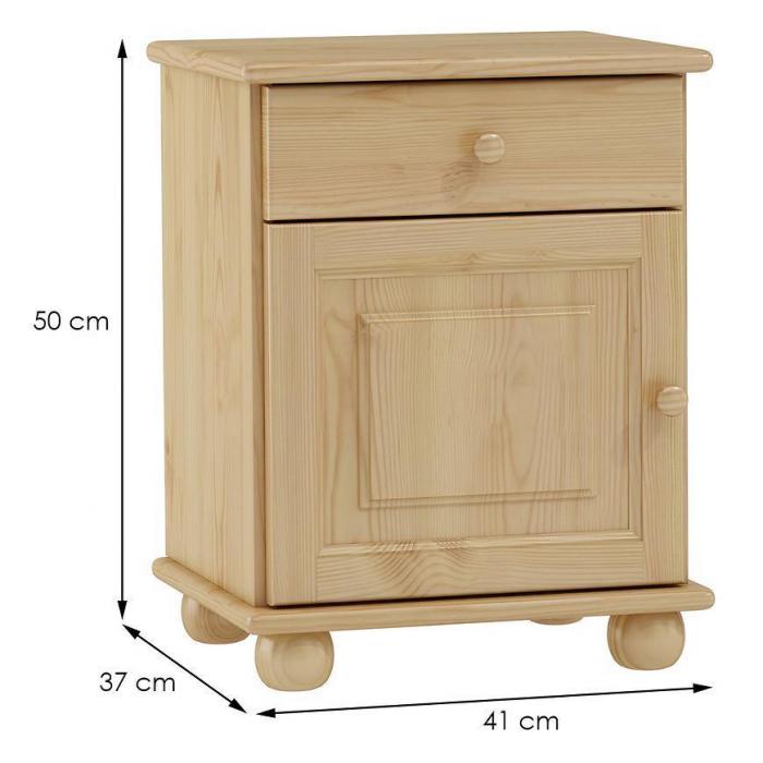 Szafka nocna została wykonana w stylu klasycznym. Jest to praktyczny i funkcjonalny mebel. Konstrukcja szafki jest stabilna i wytrzymała. Materiał wykonania to drewno w kolorze sosny. Szafka nocna posiada jedną szufladę i jedną zamykana szafkę, w której można umieścić najpotrzebniejsze rzeczy. Szafka z pewnością znajdzie swoje zastosowanie w sypialni, ale również w salonie pełniąc rolę małego stolika. Mebel jest już złożony.