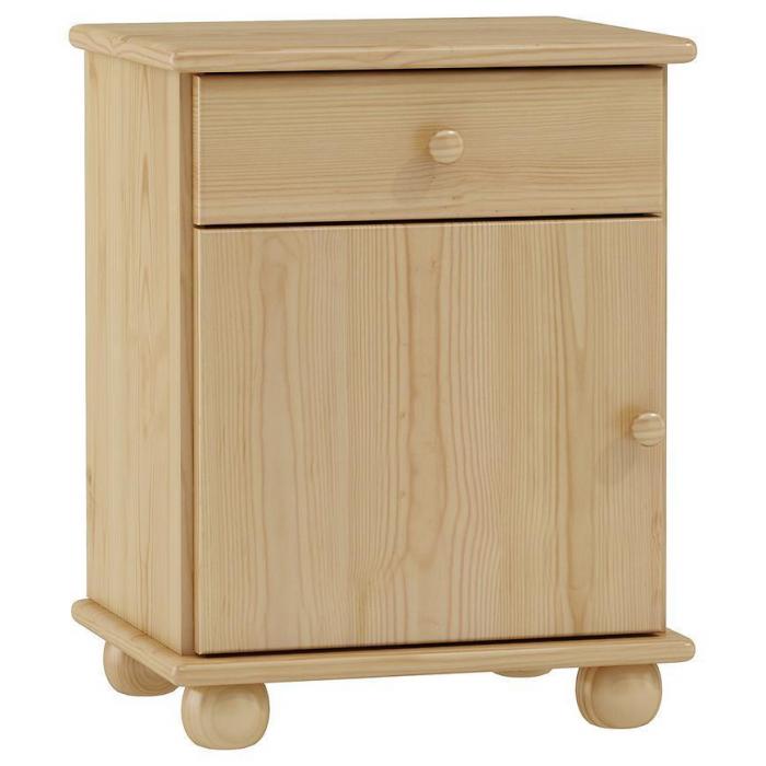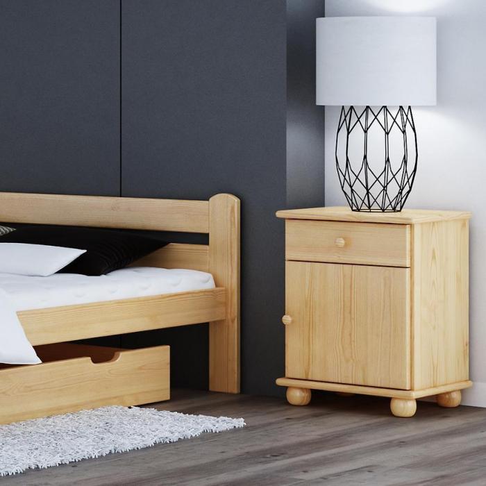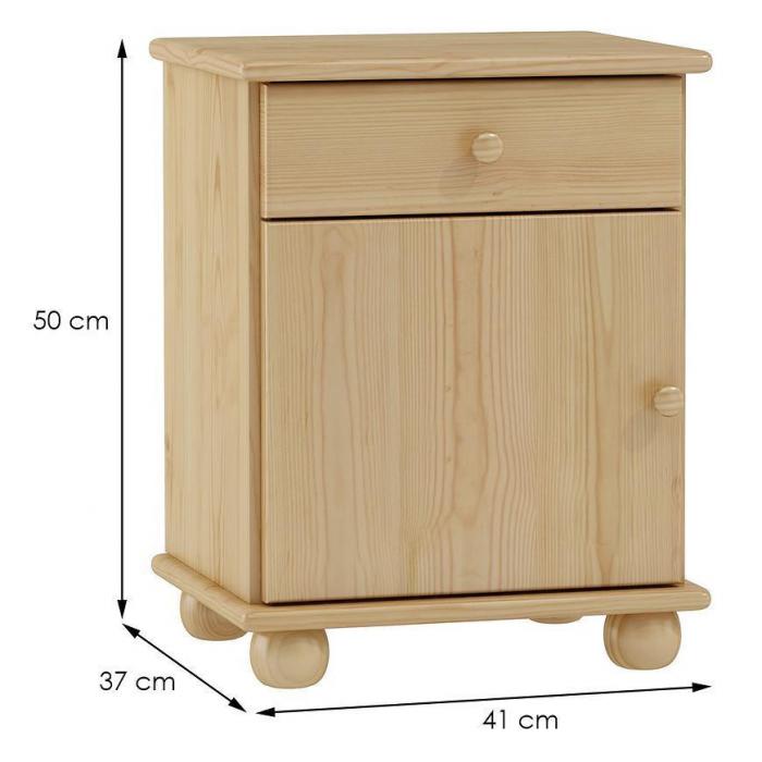 Szafka nocna została wykonana w stylu klasycznym. Jest to praktyczny i funkcjonalny mebel. Konstrukcja szafki jest stabilna i wytrzymała. Materiał wykonania to drewno w kolorze sosny. Szafka nocna posiada jedną szufladę i jedną zamykana szafkę, w której można umieścić najpotrzebniejsze rzeczy. Szafka z pewnością znajdzie swoje zastosowanie w sypialni, ale również w salonie pełniąc rolę małego stolika. Mebel jest już złożony.