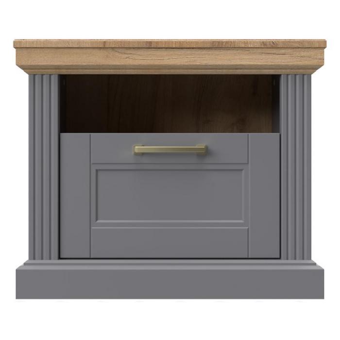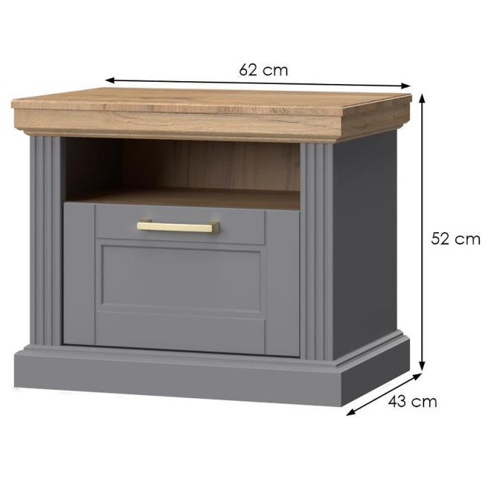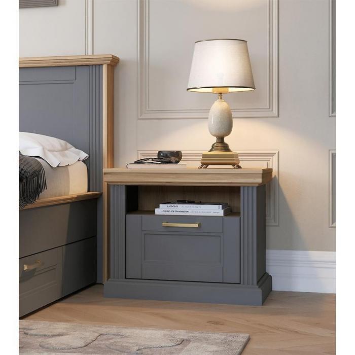 Szafka nocna została wykonana w stylu prowansalskim. Jest to praktyczny i funkcjonalny mebel. Konstrukcja szafki jest stabilna i wytrzymała. Materiał wykonania to płyta wiórowa lakierowana/płyta wiórowa laminowana w kolorze graphite/pacific walnut. Szafka nocna posiada jedną szufladę i półkę, w której można umieścić najpotrzebniejsze rzeczy. Szafka z pewnością znajdzie swoje zastosowanie w sypialni.