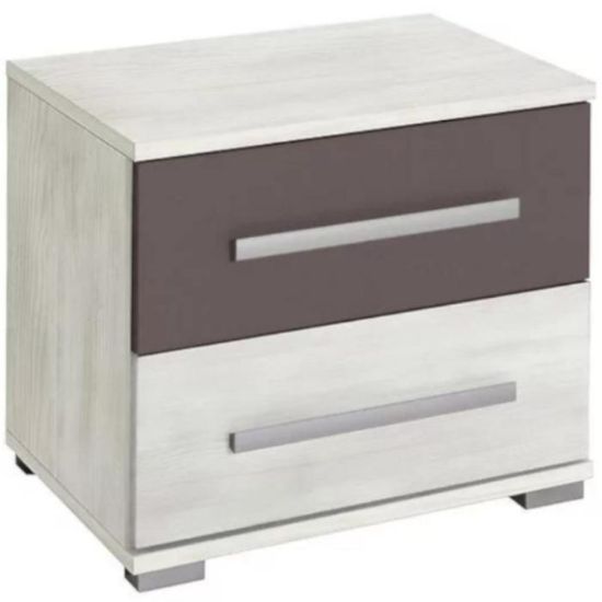 Szafka nocna to wygodny i praktyczny moduł. Idealnie wpisze się w nowoczesne wnętrza, nadając ciekawego wyglądu. Wykonana z odpornej płyty wiórowej laminowanej. Fronty wykonane w kolorze sosny norweskiej/popieli, a kolor korpusu jest jasny drewnopodobny.
