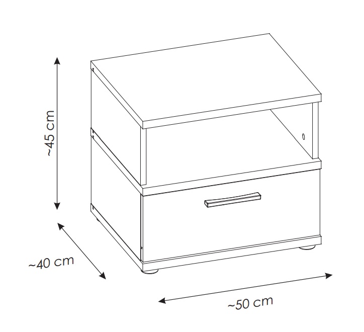 Szafka o wymiarach 50 cm szerokości, 40 cm głębokości i 45 cm wysokości doskonale sprawdzi się przy łóżku, oferując wygodną powierzchnię blatu na lampkę nocną, książkę lub kubek z napojem. Jej prostokątny blat zapewnia stabilność i pozwala utrzymać porządek nawet w niewielkim pomieszczeniu.
