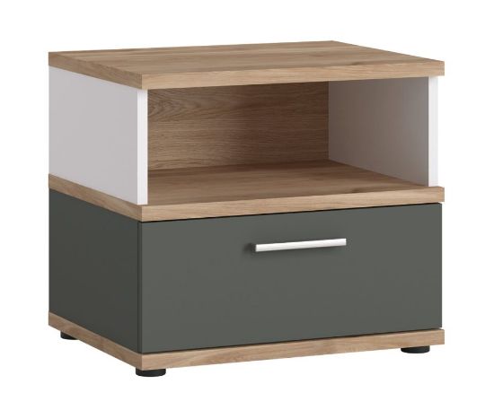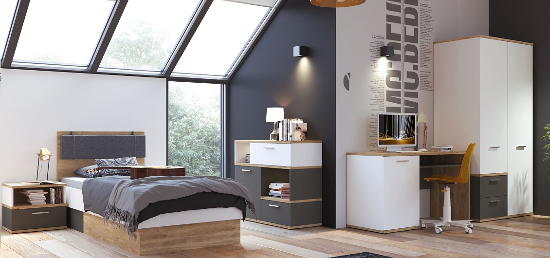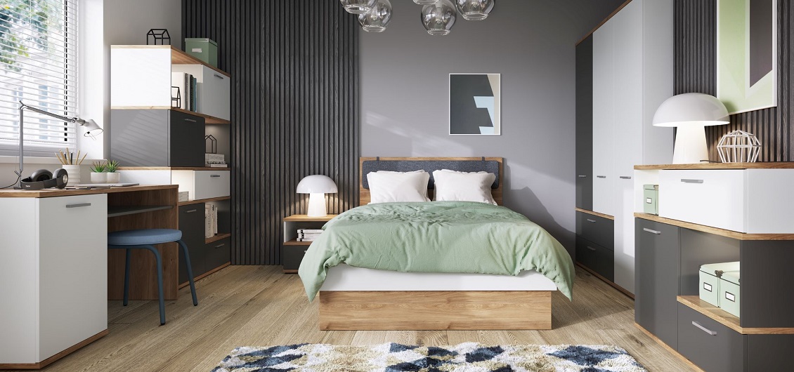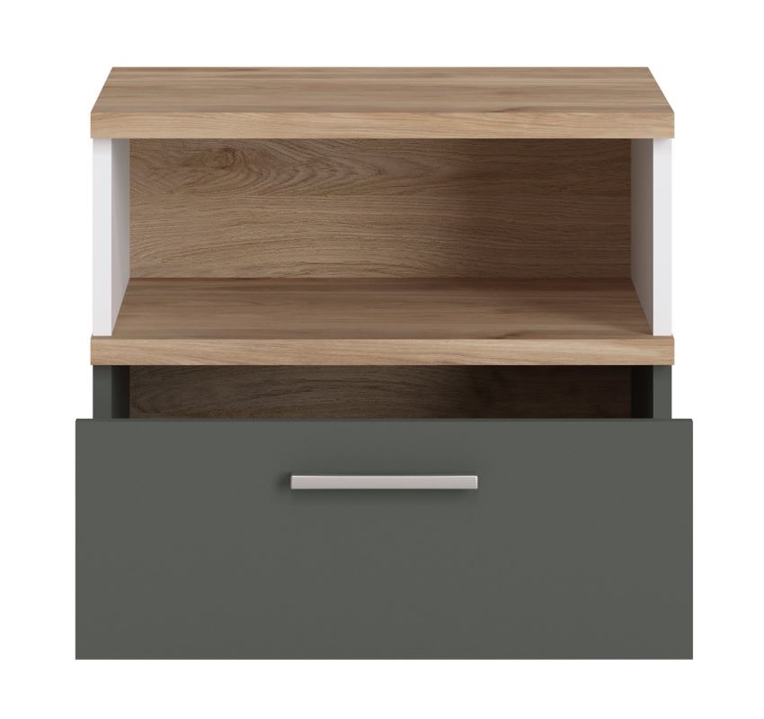 Szafka nocna Twenty wyróżnia się nowoczesnym, minimalistycznym stylem, który doskonale pasuje do współczesnych aranżacji wnętrz. Połączenie koloru szarego grafitu z białym alpejskim i dębem honey castello tworzy przyjemną, stonowaną kompozycję kolorystyczną, idealną do pokoju młodzieżowego. Fronty w matowym wykończeniu podkreślają elegancję mebla, nadając mu subtelny, ale wyrazisty charakter.