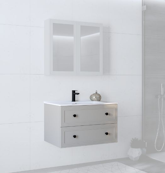 Szafka pod umywalkę Terra 2S w kaszmirze matowym łączy klasyczny design z glamour. Korpus z płyty meblowej laminowanej i front z foliowanego MDF zapewniają trwałość i elegancki wygląd. Wymiary 80/45/46 cm oferują praktyczne miejsce do przechowywania kosmetyków i akcesoriów, a kompaktowa forma sprawia, że mebel dobrze sprawdza się w łazienkach o różnych wielkościach.