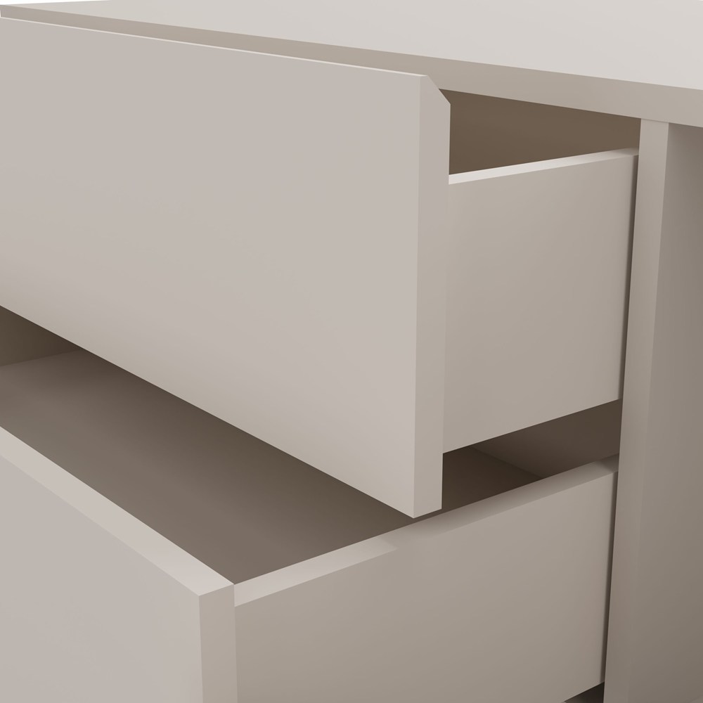 Całkowite wymiary szafki to 140 cm szerokości, 37,5 cm wysokości oraz 53 cm głębokości, co zapewnia optymalne proporcje i wygodę użytkowania. Szuflady oferują dużą przestrzeń wewnętrzną – 63,5 cm szerokości, 38 cm głębokości i 10,5 cm wysokości, co pozwala na wygodne przechowywanie niezbędnych akcesoriów. Fronty szuflad o szerokości 70 cm i wysokości 18 cm podkreślają nowoczesny charakter mebla.