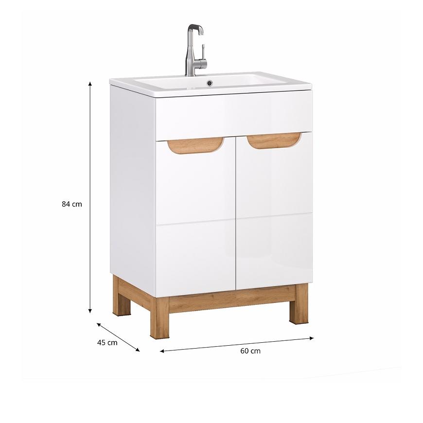Ze swoimi wymiarami: 84 cm wysokości, 60 cm szerokości i 45 cm głębokości, szafka oferuje odpowiednią przestrzeń do przechowywania różnorodnych przedmiotów łazienkowych.